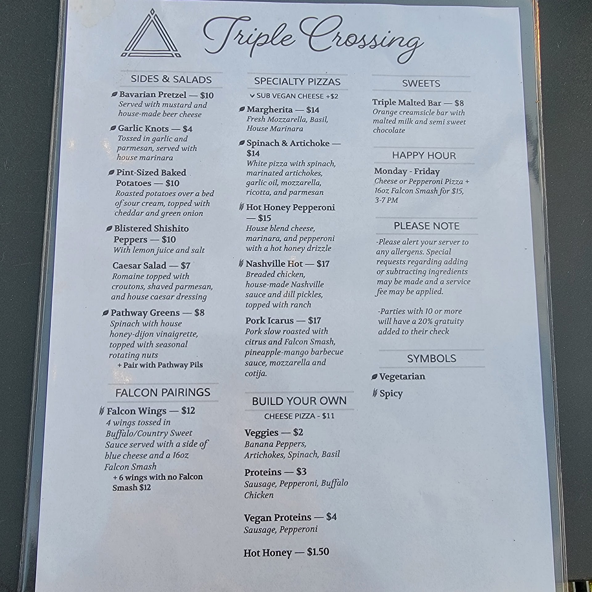 Wife and I were excited to give Triple Crossing a try and visited on a Saturday at about 1 o'clock. Walked in to a long line and hopped in. Didn't take too long maybe 15 minutes, got to the lady at the bar and said we'd like to sit for lunch and a drink were told "that's first come first serve" which means we waited in line for no reason at all. Some advice to the owner would be make that a little more clear. But no big issue, all the seats were full until that exact moment when two tables opened up. Ordered two pizzas (White and Hot Sausage) and two Demon Days Red Ale. You have to start a tab if you are eating or drinking and all the servers are at your beck and call there are no waiters or waitresses in the traditional sense. Drinks came out immediately and were very refreshing and full of flavor, solid notes of hops. Our pizzas came moments later with a pile of napkins. No plates. Didn't matter we were hungry and figured if they didn't care that food got all over their tables neither did we. We unfolded a couple napkins and dug in. Both were excellent thin crust pizzas and I loved the leoparding on the pizza (burnt bits). The white pizza was my favorite and both were dispatched with haste. As a sweet after meal drink we ordered two Black Dolphin with Coconut Stouts, holy crap were those good. Immediately purchased a 4 pack of the Black Dolphin. Just got done sharing a few with some friends while playing board games. All agreed it is an excellent stout. Very sweet almost chocolate like and extremely smooth. But watch out this dolphins got teeth weighing in at a 10% alcohol level. All in all a great experience, would be a 5 if the restaurant side of things was a little more clearly laid out. Fully...