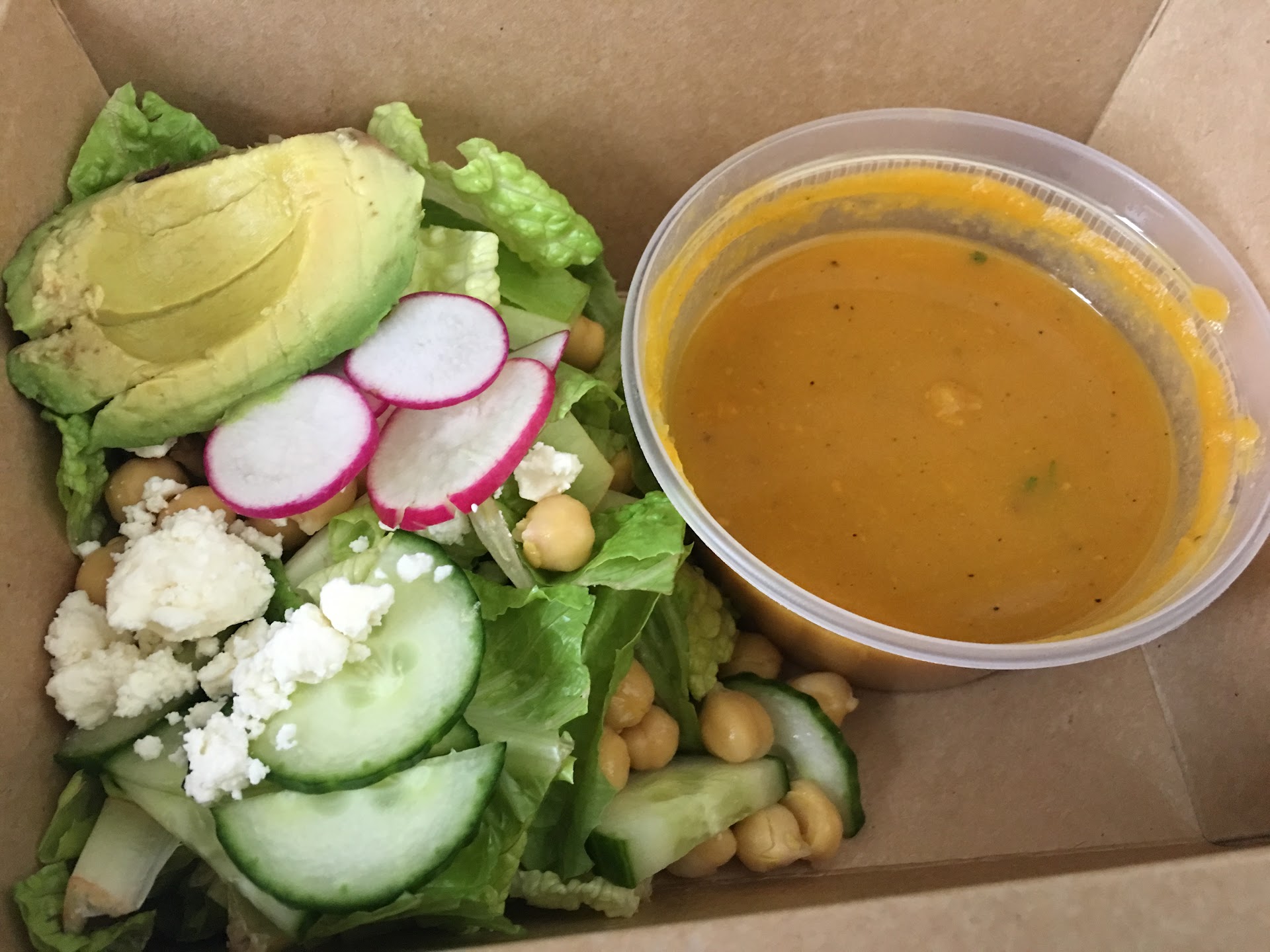 I ordered the "pick two" combo where you're able to mix and match sandwich, soup, and said options. I chose the sweet potato soup and chopped salad. I jumped out on a limb going that there sweet potato soup would not only have a hint of sweetness, but that it would also have savory tones. And guess what? It did! It's absolutely wonderful - you have the sweetness associated with the potato and at the end there's a burst of flavor! I played my soup with the chopped salad. I wanted a basic salad with a little twist. The chick peas and feta have met the little twist I was looking for.