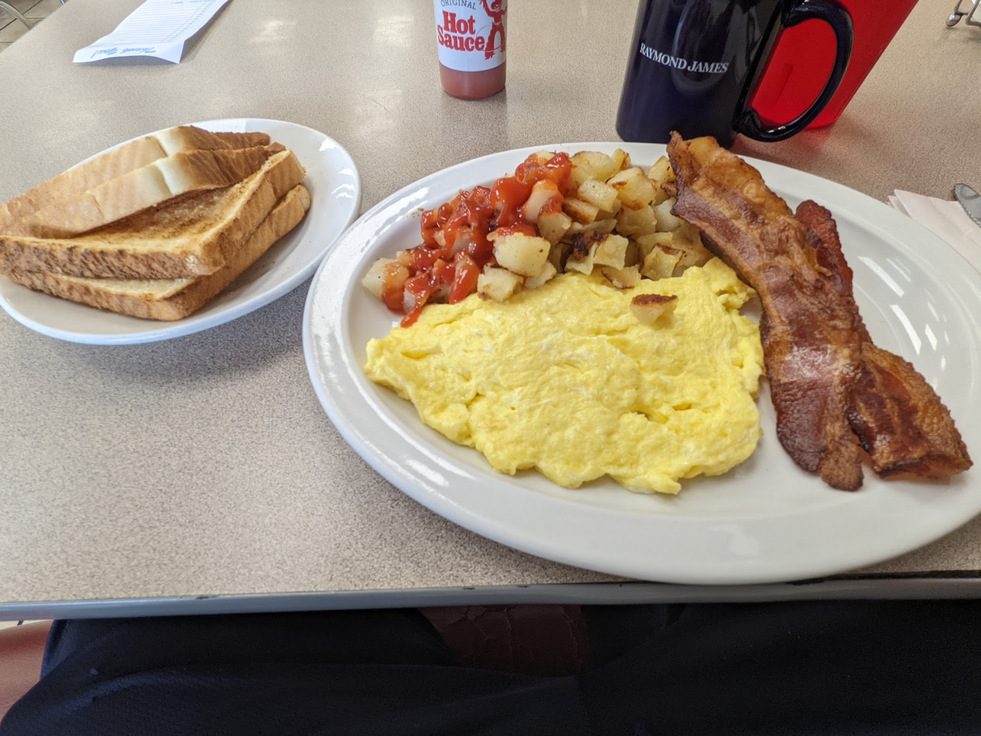 "The Special" was Chef name redacted's take on a deconstructed skillet. Nice chunky potatoes, a good slab of egg, and crispy crispy bacon. I think it works. Pardon my impatience as I added ketchup and hot sauce to the potatoes before taking the picture (sorry boss). The coffee was definitely coffee. The service was efficient and polite Mr. "Call Me Whatever You Want" was getting the job done, and quickly. The ambiance was sort of halfway between a pharmacy and a diner, leaning more towards the diner side. I'd recommend this spot, and I'll be back next time I need breakfast and a jigsaw puzzle in one convenient stop.