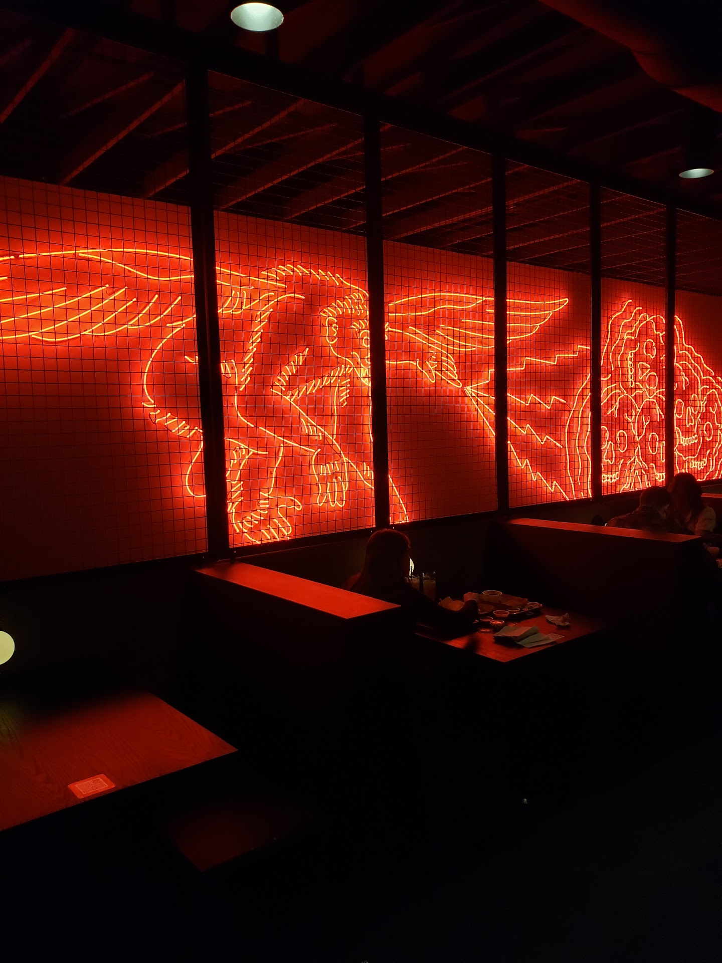 Enjoyed the atmosphere as well. Very spacious and the neon lighting upstairs made it feel as if we were dining in a scene from Blade Runner.