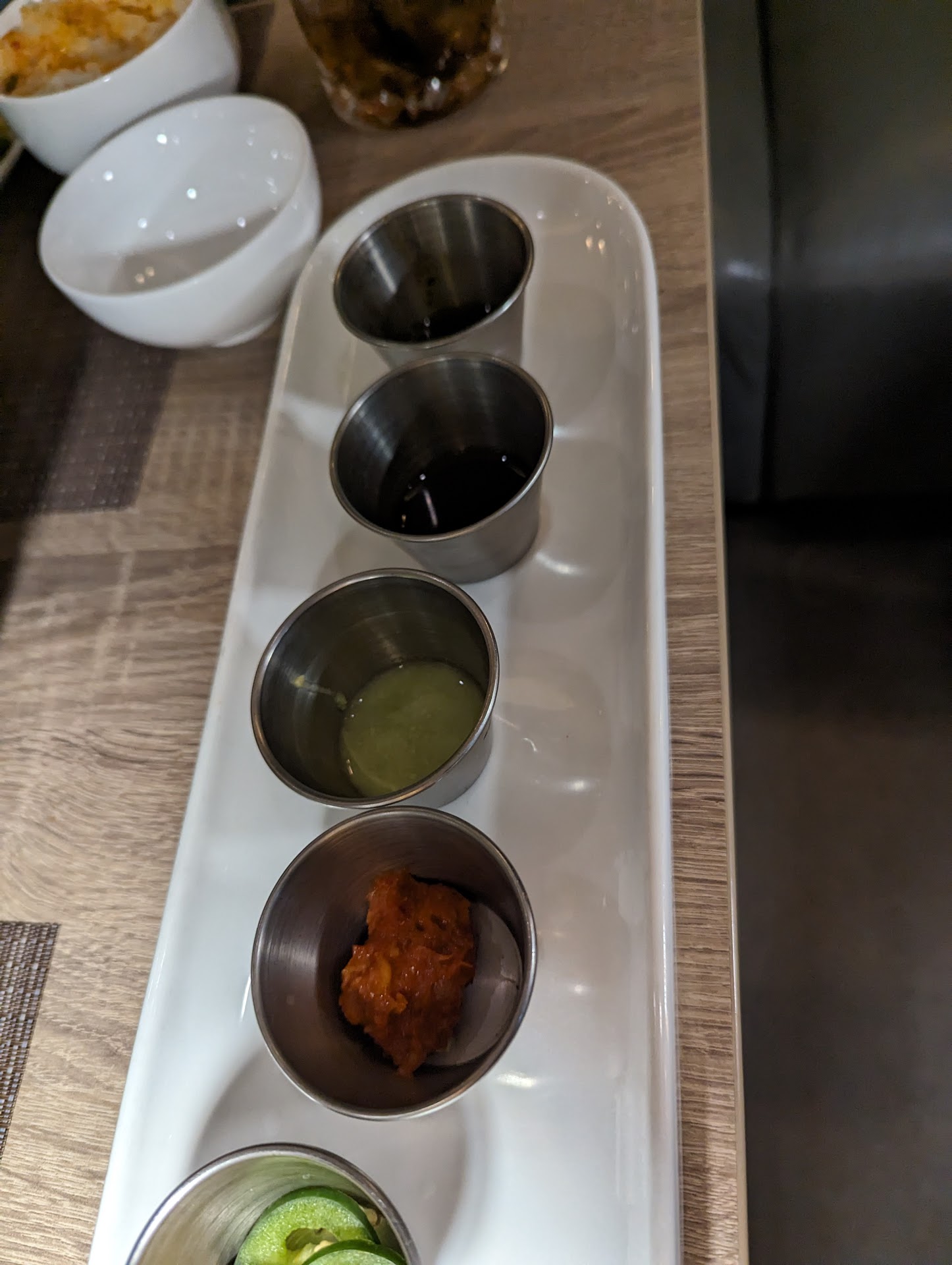 For the service, I attribute it to poor training, little experience and/or poor management or lack of. Taking orders, serving water and beverages shouldn't take 20-30 min. I don't mind waiting for the food prep especially if it's busy but water is the least you can provide. I don't want to knock the servers intentions because he was mostly kind. The issue is that he was absent and sometimes overwhelmed. As I mentioned earlier, what topped it off was the comically tiny amounts of sauce in the dishes came with it. It urked me because the server looked at the sauces too, and then looked at me for a reaction as if he was waiting for me to state the obvious. He must've seen it too. The average person could look at this and tell you that there is barely anything in the cup. So, why serve it like that? We laughed when we first saw it. I thought they were messing with us. I later asked him for more and he gladly did. Oh, and we didn't get the sauces until we tracked down the server again. It was supposed to come with the platter, and they forgot, which again, we had to ask them for it.