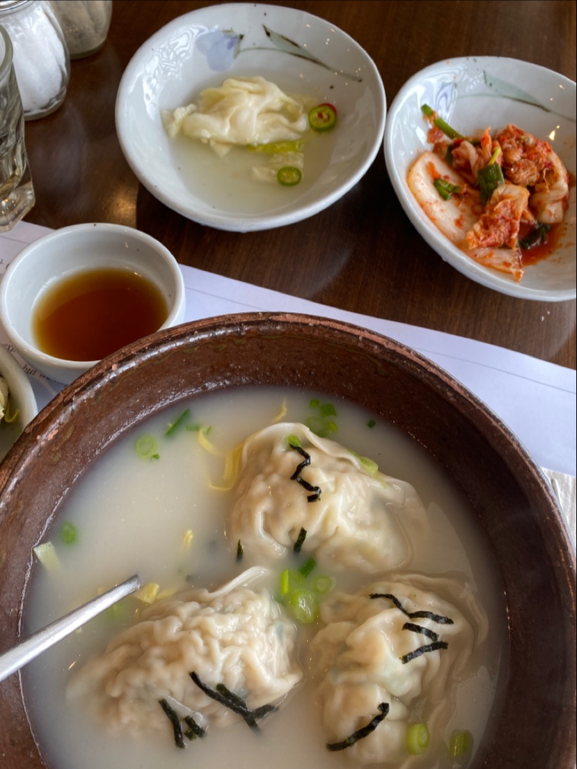 One of my wife's fav spots in this neighborhood. We only eat dumplings here and that is what they are about. The soram dumplings are hand made (you can see the restaurant ladies making them at the corner table) and are very good on their own or in the soup menu. The bone broth soup the dumplings come in are good as well (be sure to add salt and pepper for your taste). You can tell the quality of food overall is very good and everything feels very clean here. I like how they serve out a small portion of pumpkin soup in the beginning as well. Btw if you like the dumplings you can purchase the frozen ones to cook at home as well! Restaurant space is cozy and compact. There is plenty of parking and you can shop in the h mart before or after the meal, or hit up paris baguette for coffee or...