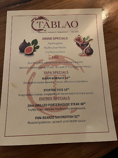 One of the best restaurants in Ridgefield, if not the whole area!!!! Tablao is a beautiful restaurant, with a kind and compassionate staff who truly cares about their customers! The food, for a tapas place of this incredible quality, is well priced, and is absolutely delicious. Well seasoned, beautifully plated, and so so lovely!!!! I wish I had pictures of our tapas but wow, they were eaten so quickly from how fantastic they were!!!! As a family of four, we were seated pretty quickly, especially for not having a reservation. The staff were super friendly, and came by to check on us a few times while we enjoyed our wide range of tapas, greeting us with smiles, witty humor, and plenty of fantastic suggestions!!!! We loved too how good natured the servers were with one another, and how well the restaurant has adapted to social distancing. It felt both private and social all at once, and we adored it!!!! We ordered a variety of items, including the cheese croquettes, the Brussel sprout salad, the spinach (A HIGHLIGHT AND MUST TRY), the tortilla española, and the special of the day: the ricotta stuffed squash blossoms. It seemed our food was inhaled that day, complimented by a wonderfully refreshing sangria. In our family, dessert is something we take quite seriously, as it is the sweet note to end the meal. And we ended up enjoying the tres leches and the bread pudding. They were beautifully presented, artfully crafted, and tasted fantastic!!!! What was even better: how happy we felt from the fabulous experience of getting to eat at Tablao- if you’re curious to try the food, please do go for it!!!! You are on your way to a wonderful food adventure that is delicious, creative, and fantastic!!!! A true reminder of the beauty of Spanish cuisine, and a real highlight to my restaurant experiences...