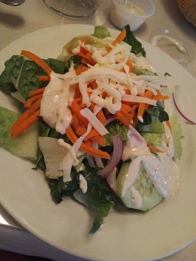 Entrées come with either a cup of Pasta Fagioli soup, Caesar salad, or for a dollar upgrade, the House Italian Salad with Gorgonzola. Anchovies can be added to either for another dollar. My partner had the soup which he enjoyed. I chose the House Italian Salad, which was large enough for me to give him some after a few bites, but we wondered where the gorgonzola was seeing only shredded mozzarella.