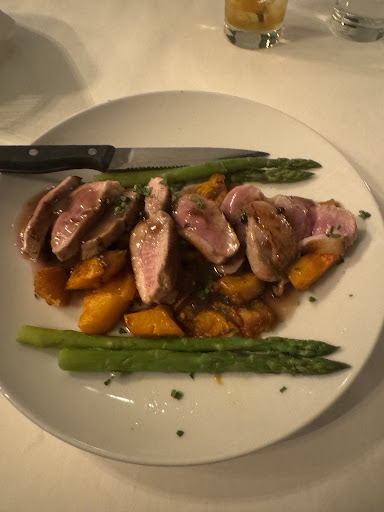 Entrè After that, my wife ordered the Duck Breast; which came with (roasted butternut squash and asparagus finished with a green peppercorn Bordeaux wine sauce.) The duck was a bit chewy and the taste was ok. We gave it a 6.5/10.