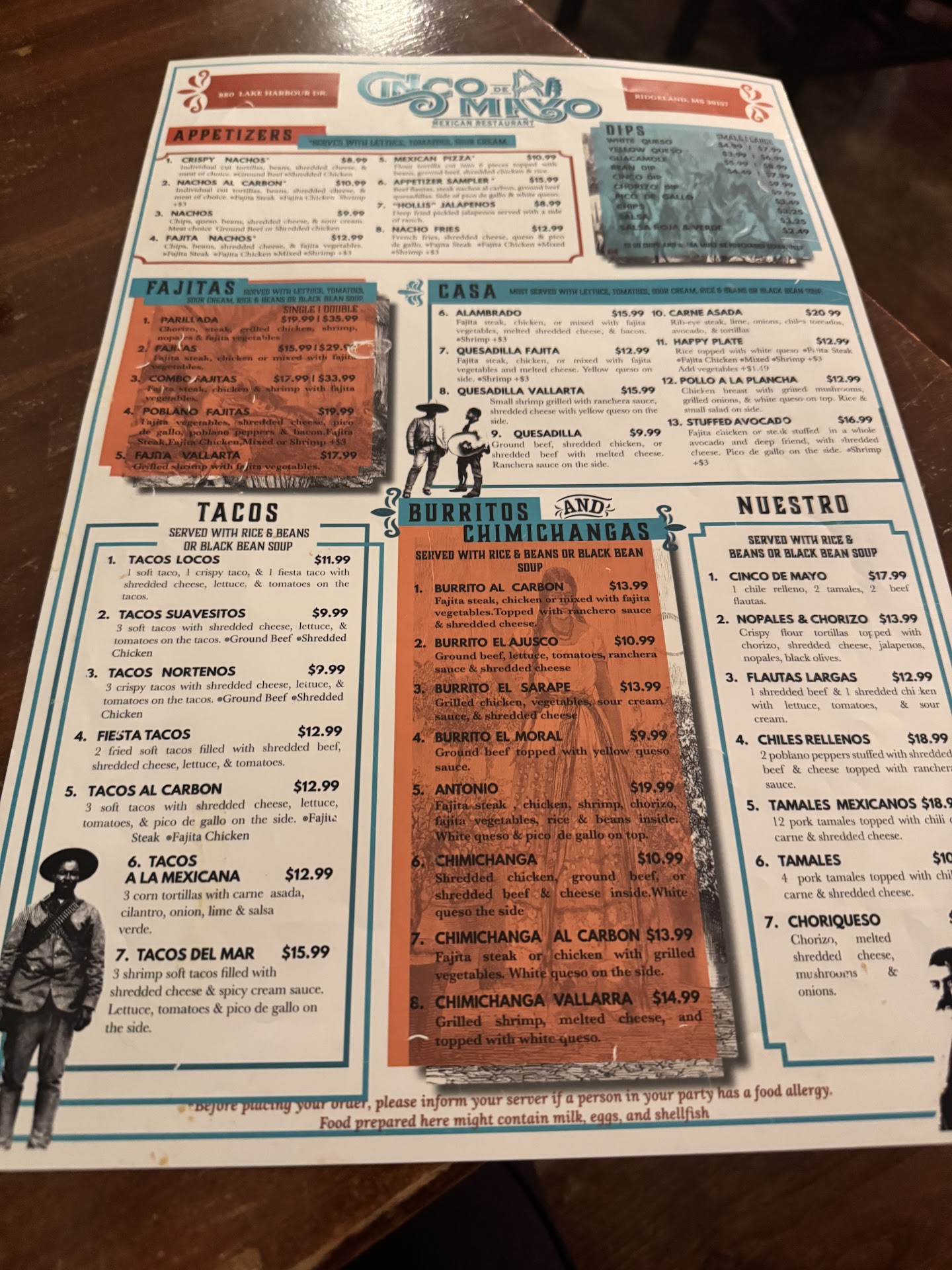 Read moreCinco is my favorite Mexican restaurant around. Yes there are newer, fancier, bigger ones but Cinco has that small, warm, cozy feeling and the best margaritas of anyone. The staff are always so friendly and make sure you have everything you need. Their great if there's ever an issue which as many years as we've been going there there's only been one instance and it was minor. We had our neice staying with us who loves Mexican so we go each time she comes. She's a picky eater and doesn't like her food to touch. I know! She'd order tacos and gave no instructions when the waiter brought them they ofcourse had lettuce tomatoes and cheese. Well she hate tomato and lettuce and said so and wasn't going to eat it. I offered to remove them but because they'd touched the rest of it she couldn't eat it. I know! I called the waiter over and explained the problem. I expected an eye roll, a smirk a grunt something but only got a huge smile and a no problem. He took it away and brought out a new plate of tacos with only meat and cheese. She now knows to specify that and now the only issue for us is wether to get a small or large cheese dip. Their food is always ready quickly and always fresh and oh so delicious. I'm picky about salsa and there's is the only ones in town I love. Not too spicy and just the right amount of kick. We always eat in the bar area which is never over crowded and less noise and is nice and cozy. Plus it's the bar and my next margarita is never far...