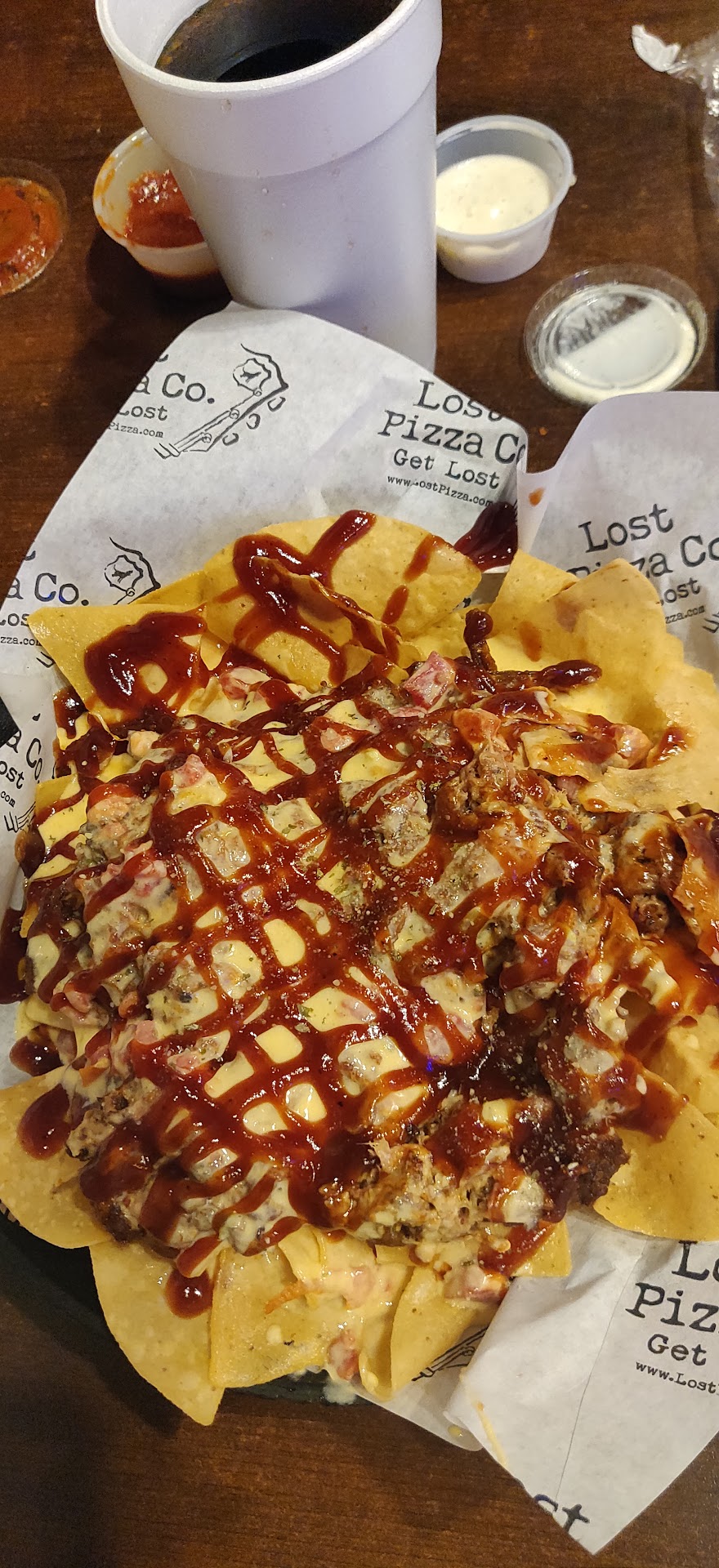 Read moreThe storefront is in the Trace station Strip Mall. The dining in option is counter service. The person who took our order was helpful and polite. The restaurant was thinly occupied at the time we went, but numerous tables had visible remnants of previous meals. Two co-workers stood near the cashier and seemingly made no effort to clean the restaurant the entire time we were there. We have experienced Lost Pizza Company in Oxford and had marvelous food experience. We have previously eaten take out from Lost Pizza at the Ridgeland location that was well received by all including fried ravioli, and various pizzas. Today we were less hungry and decided just to have appetizers including fried ravioli and the barbecue nachos. The fried ravioli were over done and nearly burnt across both orders. The barbecue nachos consisted of pulled pork, nachos, and Rotel cheese with barbecue sauce. Well the nachos were not my favorite form of nachos. They were tasty except for some parts of the pulled pork. I lack the words to describe it but something was off. Other than the initial delivery of the food, no one came to check on us or any of the other seated customers. This restaurant would do well to have on-site management...
