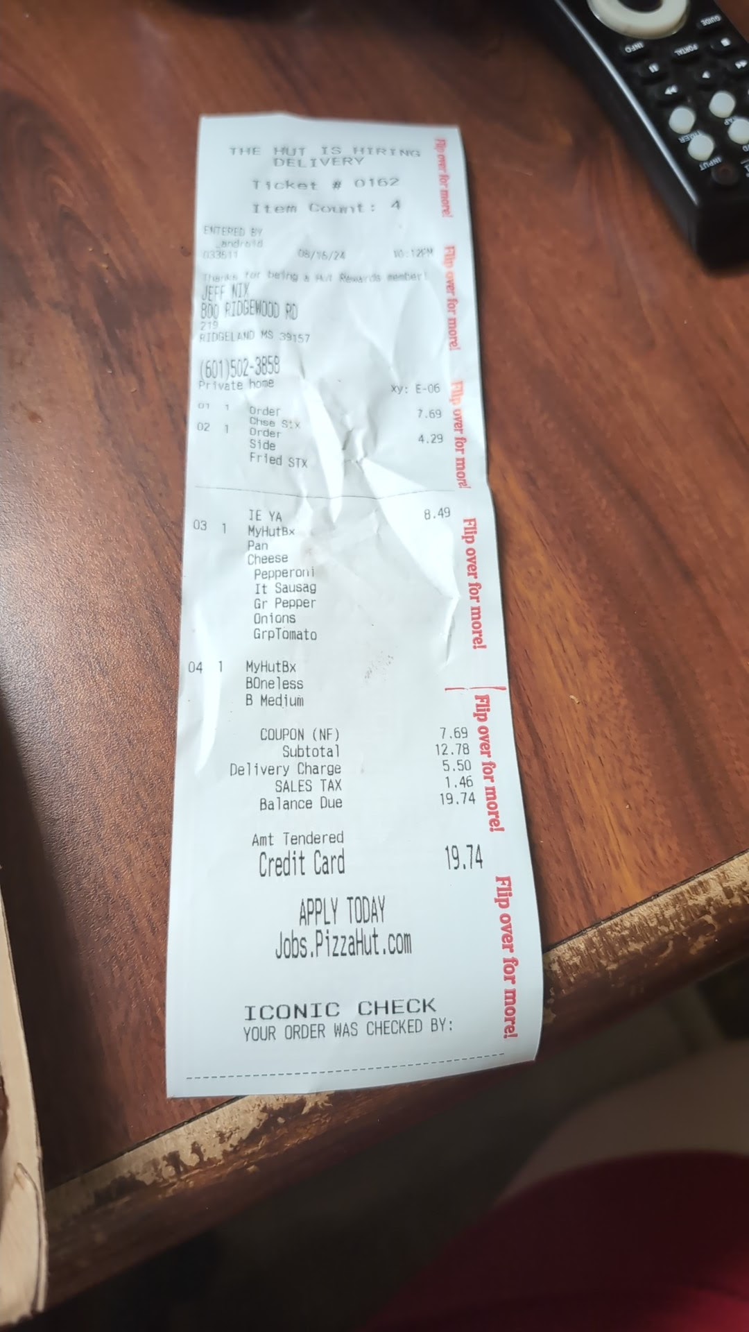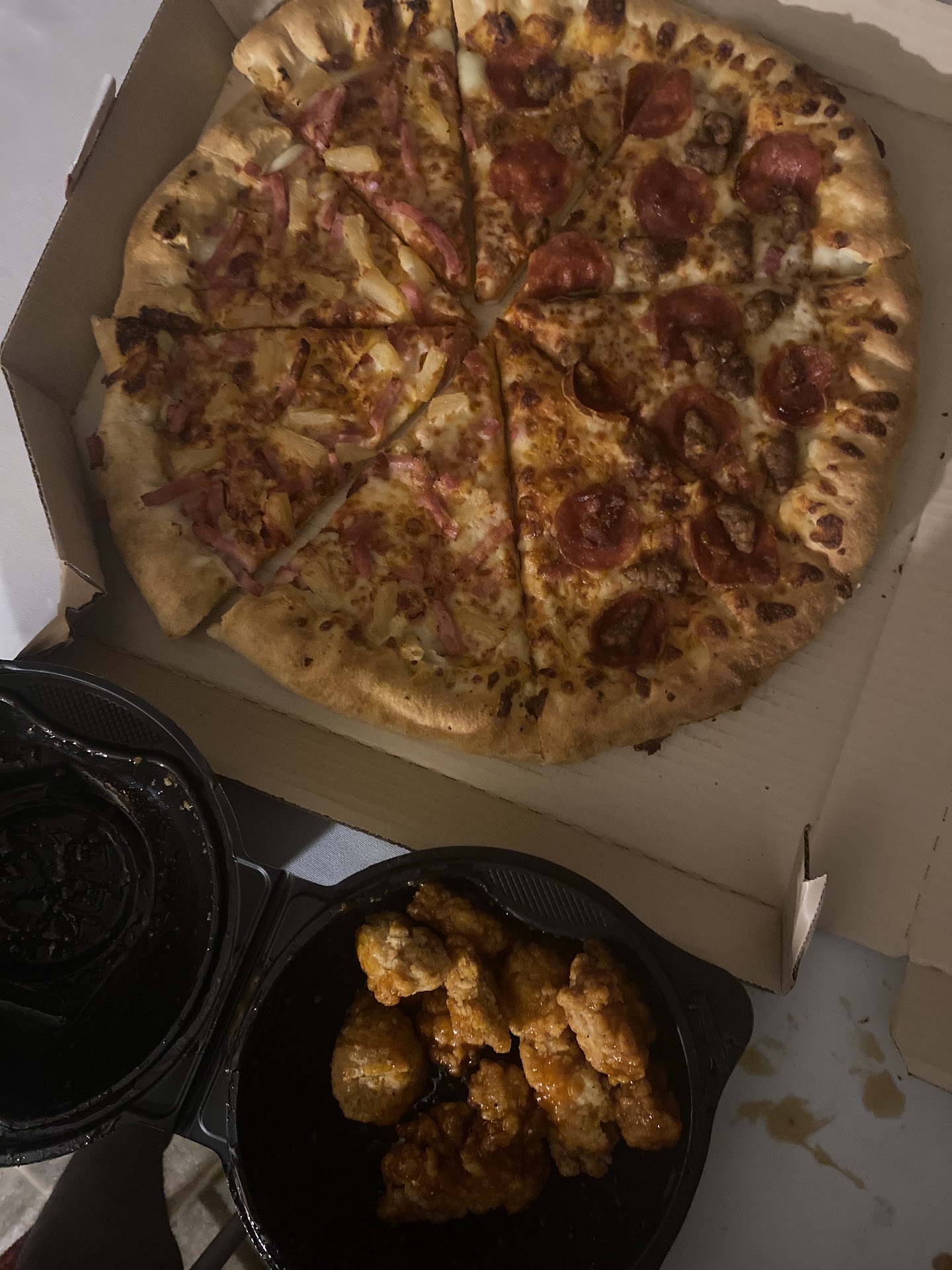 Read moreI ordered from this location (Lake Harbour) for the first time in over 2 years. I had stopped ordering Pizza Hut Pizza at this location. However, I ordered some two weeks ago and it was great. I couldn’t believe the difference from two years ago. Obviously, there’s someone there that truly cares about the quality of their work. It was so good, that I ordered again the next week thinking that I would be disappointed. Yet again, it was great! It looked great, it was cooked well and it also tasted great! I stopped ordering in the past because it wasn’t done and it just looked like it was thrown together. The two pizzas that I’ve gotten on separate occasions in the past two weeks look like they could have been on a commercial. Keep up the great work on making your pizza. I will continue to order many more as long as you guys stay consistent. The boneless wings could have used a little more sauce. They were barely coated. Other than that, no...