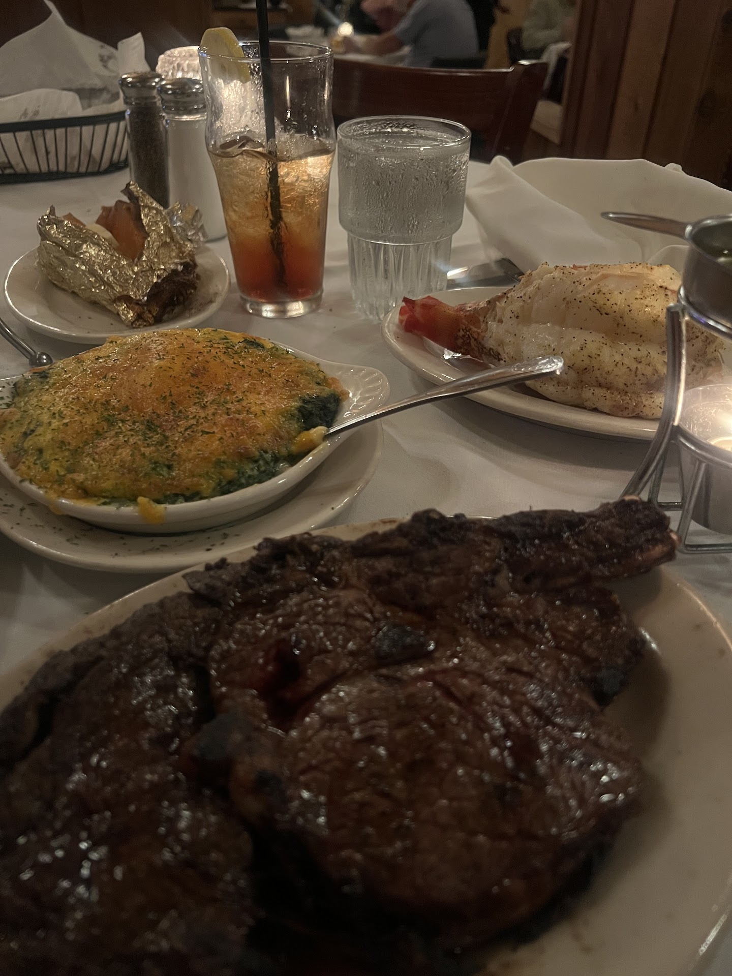 Read moreOur waitress was a very sweet girl and although she couldn't tell us what one of the appetizers was, she took excellent care of us. Of everything we ordered, the steak was the only thing worth eating. With that being said, you would think sides would be included when you pay almost $50 for a single cut of meat. We ordered stuffed mushrooms ($12 for SIX) and immediately sent them back they were so bad. We got an order of onion rings and while it was only $5 for a heaping basket, they were limp, unseasoned, and the breading fell off before you could pick them up. The steamed broccoli was more like they microwaved it without adding water as it was tough and dry. It was completely unseasoned, not even a pat of butter. The potatoes and onions were awful and loaded with grease. I ate two bites, my husband ate a single bite and didn't touch them again. The asparagus wasn't terrible but there were only half a dozen pieces and they obviously didn't trim the stalks before cooking them. We both got a $7 "house salad" that should have been priced at $3 so at least we could have paid only a dollar per bite... But at least they gave us a quart of ranch apiece. After paying over $150 for a table of mostly inedible food, we will not be going back. Also, THEY DON'T EVEN SERVE TEA!!! I still can't get over the fact they charge separately for sides when they already charge so much for a single steak. Also, they heat the plates so hot, butter was popping and splattering on me when the waitress sat it down. I had to shield my daughter with my napkin so she didn't get popped with the sizzling butter. My husband had to flip his steak for fear of it burning on one side bc it sounded like we got fajitas. We'll be grilling our own steaks at home...