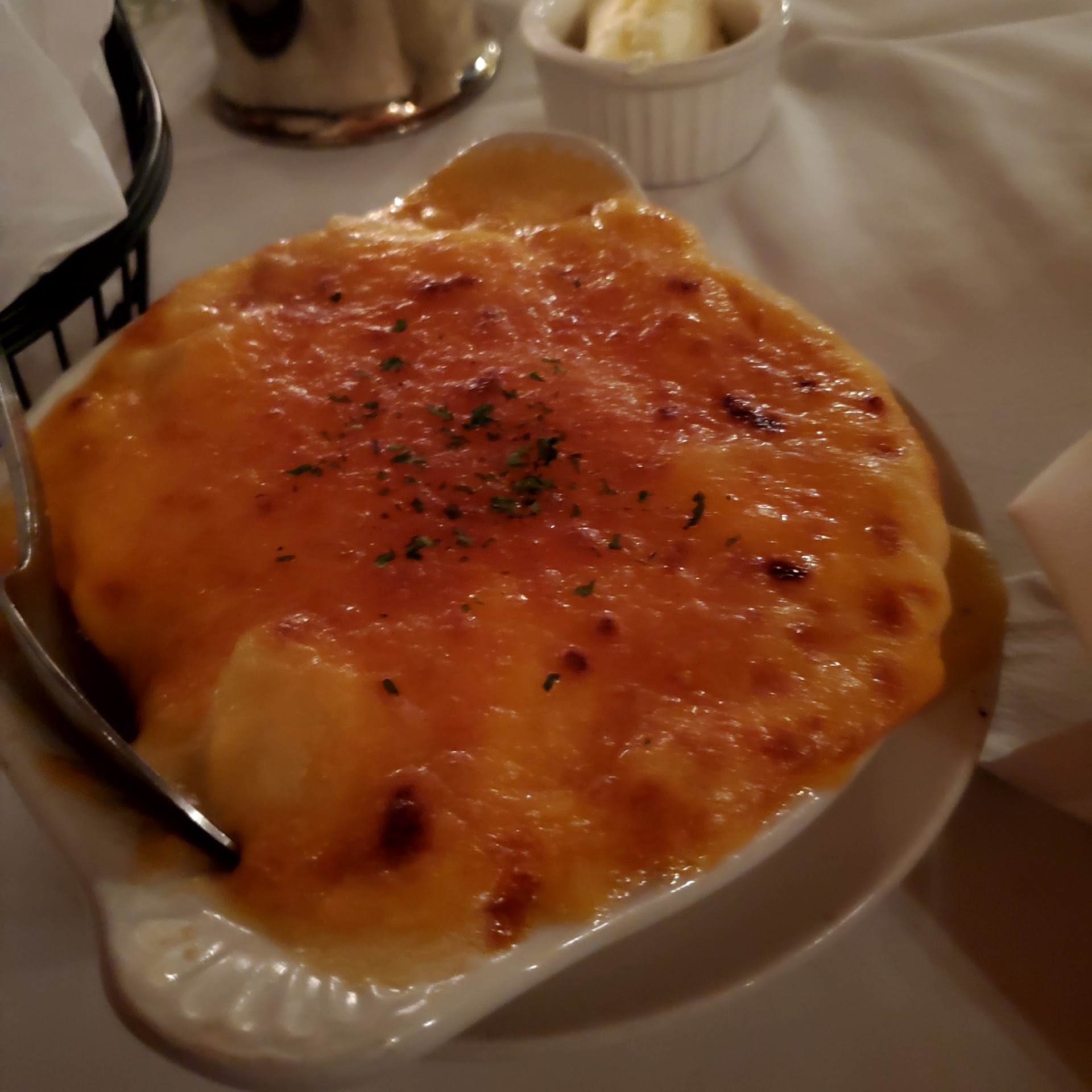 We ordered the onion rings for an appetizer, a ribeye, scalloped potatoes and shrimp scampi with pasta. We drank a glass of wine and a martini.