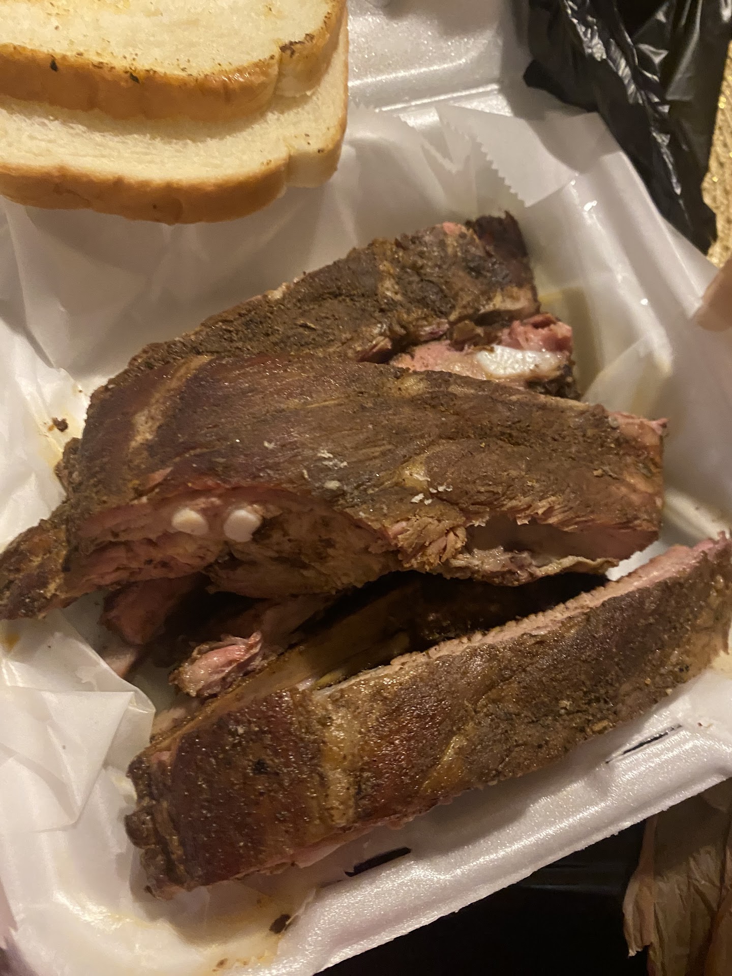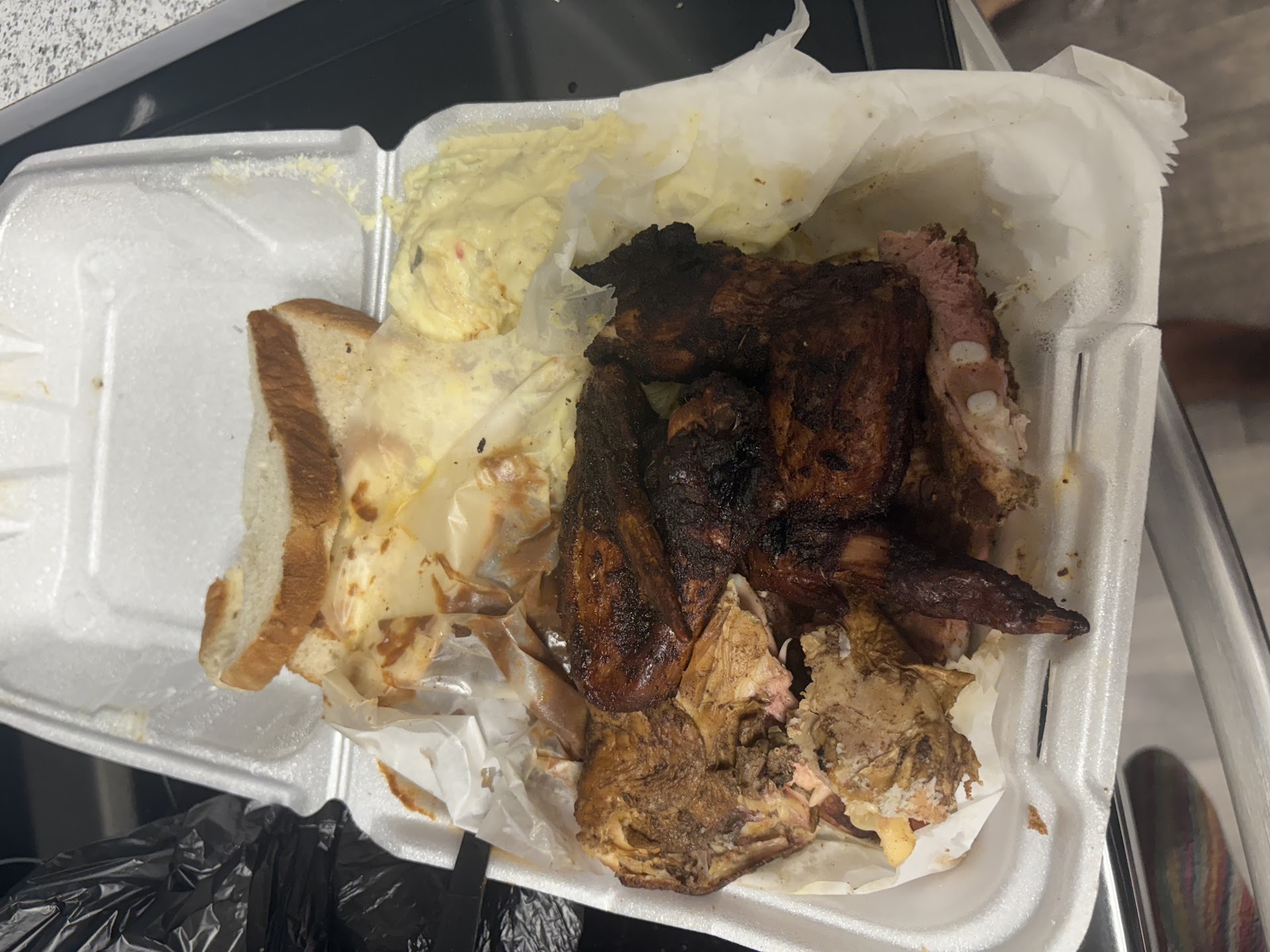 First time eating here yesterday and I donāt know if it was a off day or the reviews are fake but this was not real barbecue. I got the 3 meat plate with ribs chicken wings and leg quarter. The portions are huge but immediately opening the plate i knew the chicken was boiled or baked. The skin on the leg quarter was visibly soggy like itās been reheated. The ribs were also some kind of baked. Nothing came off the grill or smoker except the chicken wings which was close to dry and lacking flavor. Everything needed to be drowned in bbq sauce. No flavor or smoke taste whatsoever. The sides didnāt even matter at this point. I donāt like leaving bad reviews unless im wholeheartedly disappointed. This shouldve never been served. I paid 18 dollars for it because i used a discount on ubereats but this was absolutely not worth 30 dollars nor the discounted...