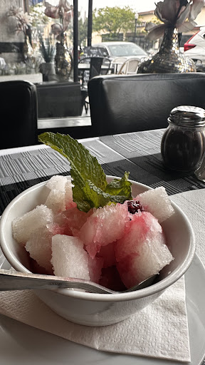 To end the meal on a sweet note, I chose the Faloodeh for dessert. The delicately flavored frozen rosewater and vermicelli noodles, topped with a tangy syrup, was a refreshing and light way to conclude the dining experience. It provided a perfect balance to the richness of the previous courses, leaving me feeling satisfied and content.