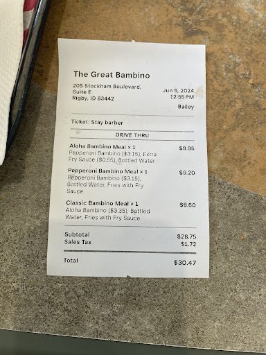 Ā Ā Ā Read moreWent to get bambinos for dinner and used to waiting a little while but tonight was out of control. Me and my husband ordered two aloha bambinos and the monday special ($1.50 off any bambino with onion rings and a bottled water or soda). We pull up to the window and paid for our meal. We waited 15 mins at the window after paying while the employees running the front goofed off and didnt bother to tell us it may take a little longer for us to get our food. Finally when brynlie (she took our order and was at the window) gave us our "food", we looked and only had our three bambinos. We politely asked where our onion rings and water were and she gave us attitude saying,"they are in the bag." We responded showing her what she handed us, " there's only bambinos. On the menu it says $1.50 off any bambino with ONION RINGS AND BOTTLED WATER OR SODA." She then got the water and still gave attitude when we asked for our onion rings a 2nd time. She finally got us our onion rings and never apologized for the wait and rudeness she gave. Extremely disappointed. Would love to give less than 1 star due to rude service and not getting our order for 15 mins then not...