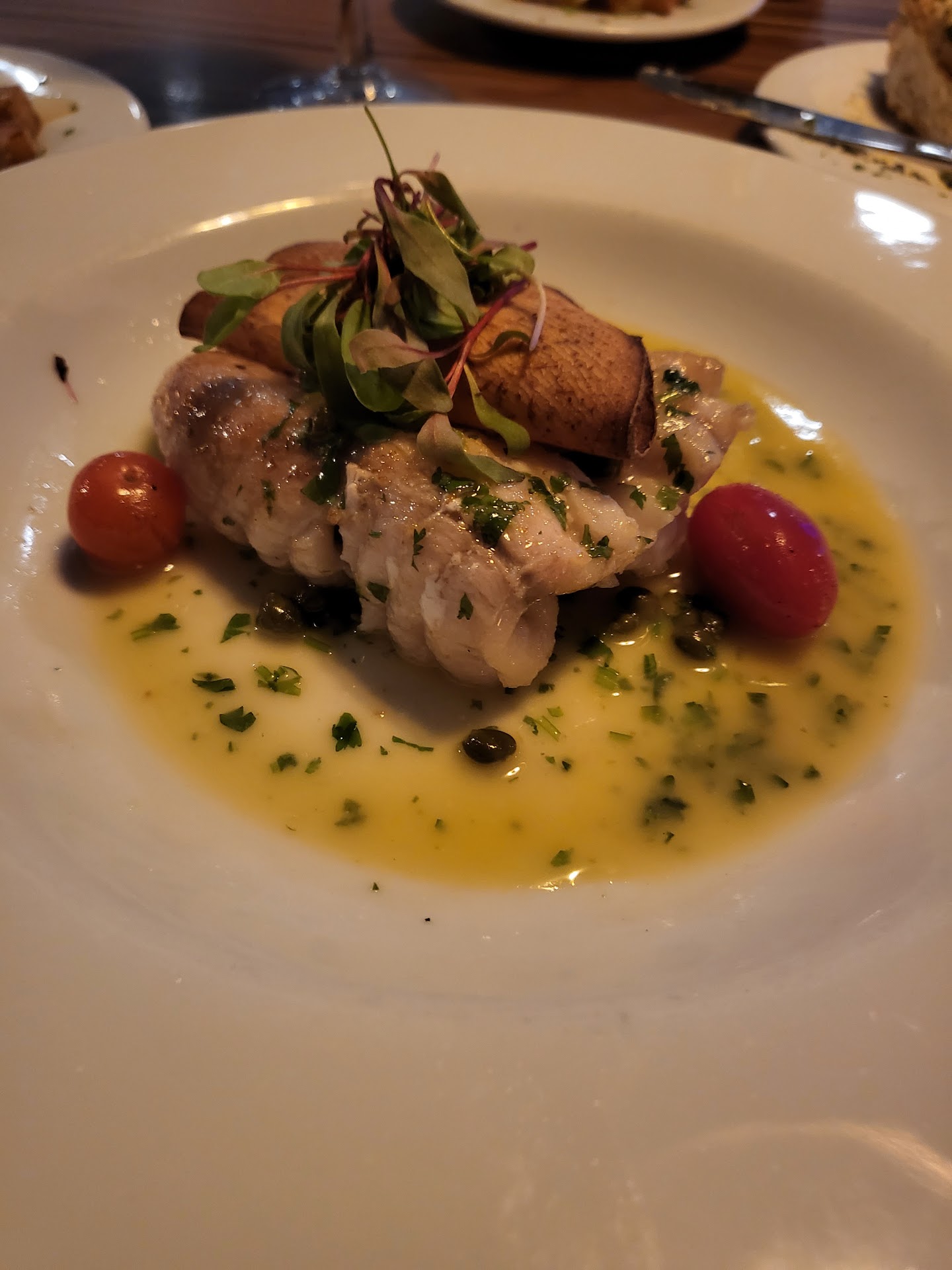 The food we ordered was DELICIOSO !!! 👍🏼 They start you off with Pan de casa (house bread) which was really yummy!! A nice light start without having to order apps. (Which myself and my guest did not do because we are actually both on a semglutide shot and cant eat much lol) I had glass of Savagnon blanc and diet coke, (seemed more seltzery than soda, which is bizzare because she poured it from the can at the table lol) He had a corona. I had the 10oz Bacon wrapped filet with a side of roasted potatoes. The filet was cooked perfectly (med well). The bacon wrap (like most places), was too rubbery to eat and there more for added flavor and appeal than anything. But definitely did add flavor. The demi glaze it was served with was very good. More like an au jus. But very tasty with the onions and peppers. The terrace chip accent was a cute interesting lil touch.