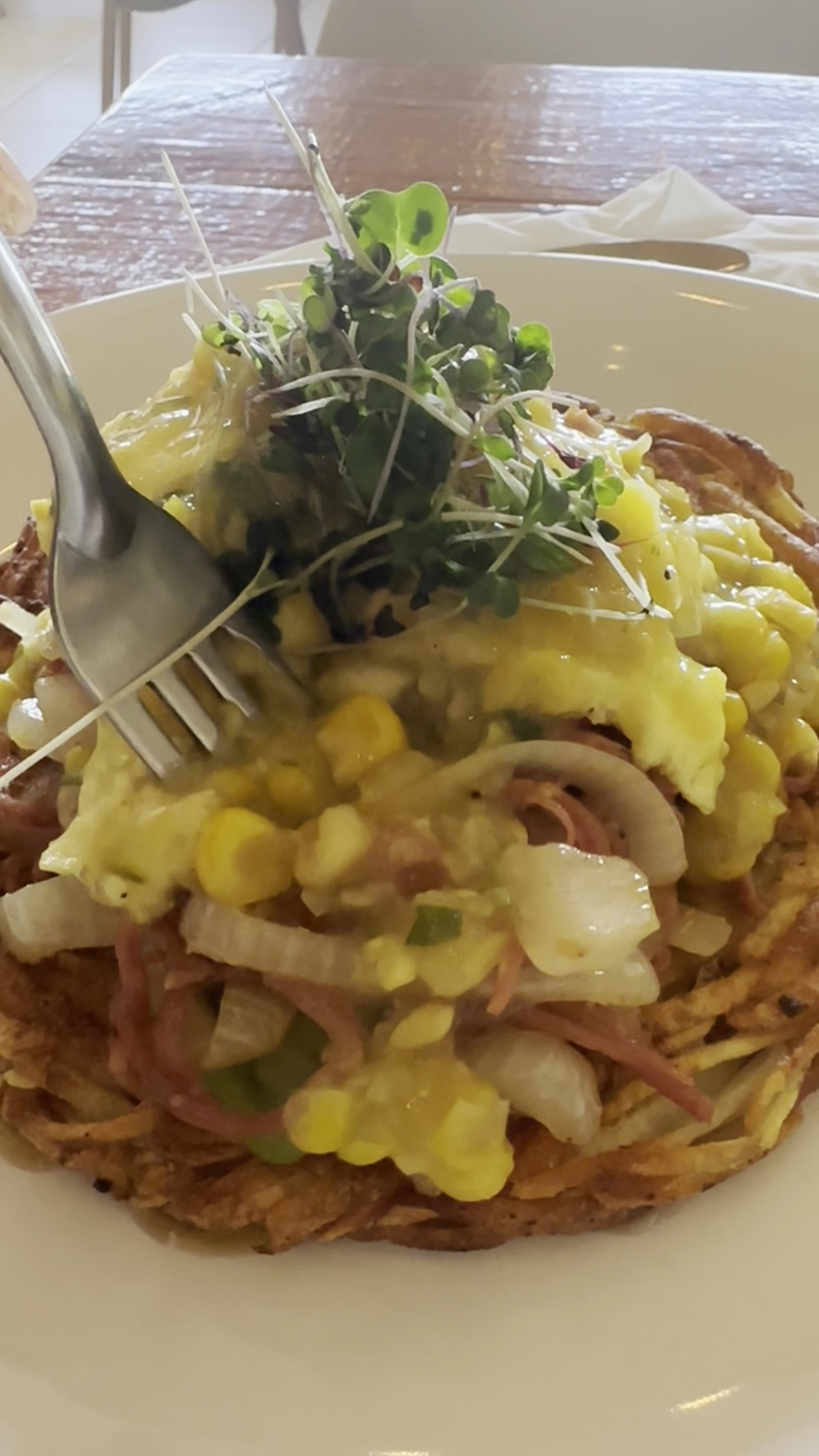 Stumbled upon this restaurant on an accidental turn. Oh my.... upon walking in you are greeted by friendly staff dressed in the cutest authentic bohemian island getup. The interior of the restaurant is charming with island vibes everywhere from its art, to its bar made of tin & wood with a tin roof awning and its instrumental boleros playing in the background. Let's talk about food...the coffee is deliciously robust & creamy. As a starter we ordered the cod fish fritters. A clever take between a bacalaito & a hush puppy. Light, pillowy & packed with flavor. Accompanied by a tartar sauce for the perfect balance between sweet & salty. We ordered the Eggs Benedict PR. Can you say yum? English muffins topped by a smokey shredded pulled pork with velvety poached eggs and hollandaise sauce. Every bite was exquisite! Next we had the waffles filled with a guava cream cheese & topped with whipped cream. No syrup required!!! Best thing about this guava cream cheese was that it was just sweet enough. Not too sweet. The pralined waffles maintained crispy through the last bite. We all washed away the food with an island favorite & must have... an ice cold jugo de parcha (passion fruit juice). Totally recommend this restaurant... the chef...