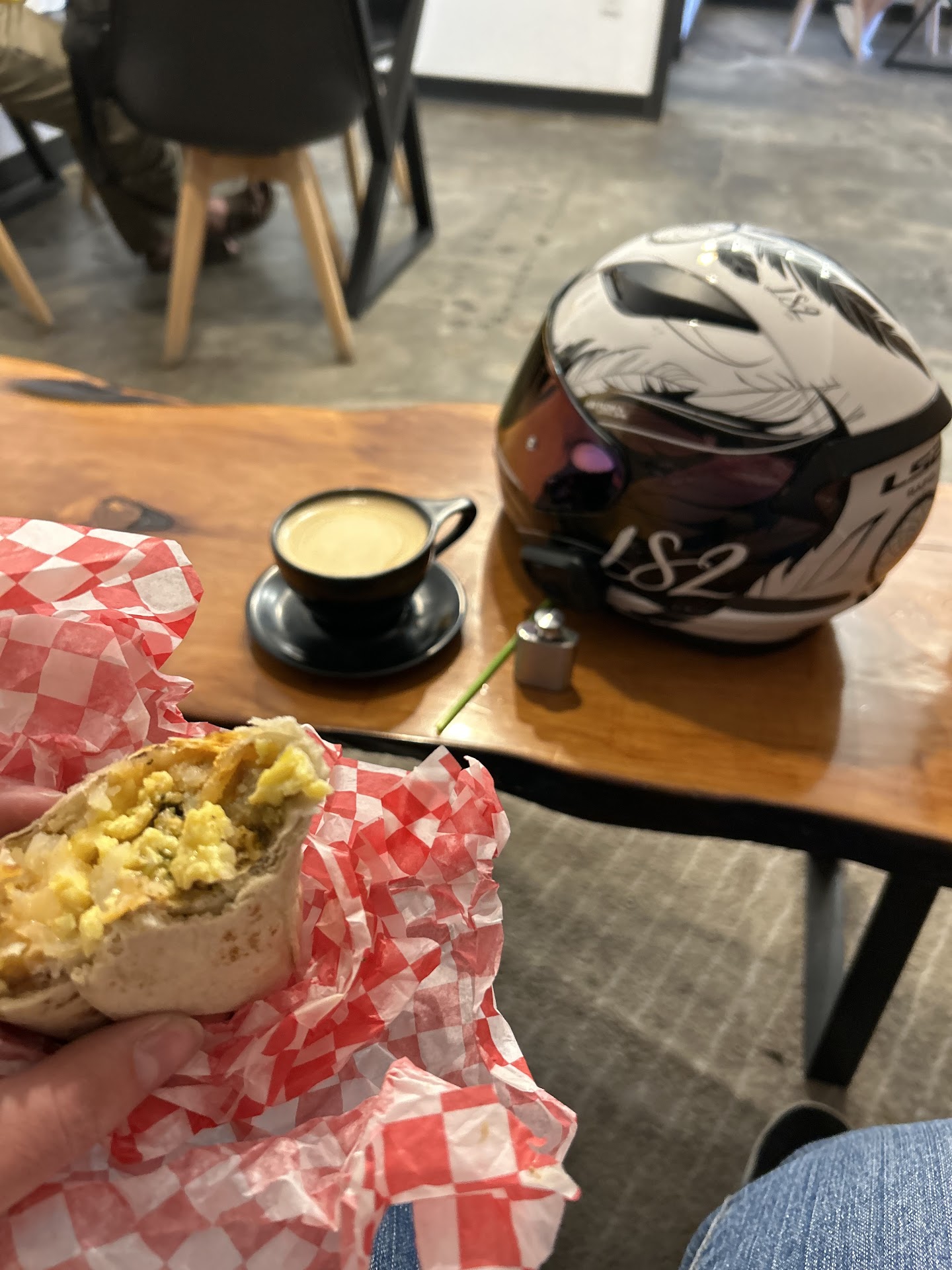 Read moreFOOD- Coffee was delicious, hot, served in a real mug that felt good in my hand. The 2 breakfast burritos we ordered, a green chile one and a vegan one were flavorful and had good spicy "heat". They are made off site by a local vendor using locally sourced eggs, tortillas, chile and cheese! Both were hot, heated with a grill press not a microwave, so the tortillas were crispy not tough. We shared a donut, too. mmmm! SERVICE- Josh is super at hospitality! We felt welcome and appreciated. You can tell that he loves what he does. ATMOSPHERE- Very cool! I liked that the coffee bar is right in the middle of the shop. We sat at a table for two, but there larger tables, bar seating and a more intimate seating area with a comfy sofa, chair and coffee table. And it has a beautiful coffee plant mural painted...
