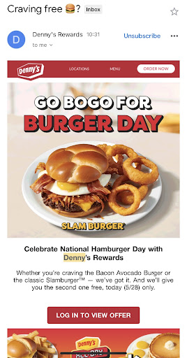 I went to Denny’s for the BOGO burger promotion that was sent to me direct via email. And was good for today 5/28. There was a coupon on my rewards account for the BOGO burgers. I did not screenshot it because I didn’t think I needed to.
