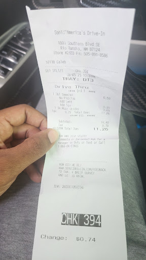Read moreI got in the drive-through line which wasnt as packed as usual but still 3 cars to order. I stayed there for 8 mins in a dead stop before I pulled up to a stall They figured would be quicker but nobody responded to the button being pressed! Drive-through line was now atrocious And there were no other stalls because they are packed with teenagers hanging out. If it was in for my very picky teen who only wanted SONIC CHICKEN I would have left. Instead I decided to order online and then pull into the next available stall And notify to through the app that I have arrived. It's disappointing that there is not green Chile when ordering online only jalapenos or so I pressed the button And let them know that I placed an order online but would like to add a side of green Chile. From the time we pulled up to this time it's been 25-30 minutes Here comes my order but it is only a side of green chili. I very kindly let the car up know that I had placed an order online And told them to look at my screen it said my name and order on it! By this time my One year old is so fussy and tired in his carseat From sitting strapped for so long. At least 10 more minutes go by then I ask the carhop for a status. She goes inside and comes back not with my order but with a manager. Car hop says this is the lady who has been waiting over 30 minutes. The supervisor says, Look ma'am I don't want to argue about time but According to the order it's only been 12 minutes! SHE WAS REFERRING TO THE GREEN CHILI ADD kSE... I did not argue I was really relieved to see another car hop bringing my food to the car. He hands me the drinks / bags and I thank him and leave! Something told me to check the order so I pull over and low and behold, NO CHICKEN and the food is cold! I laugh to keep from crying because my anxiety is through the roof I was not going to get back in line and there were no available stalls so I left so very...