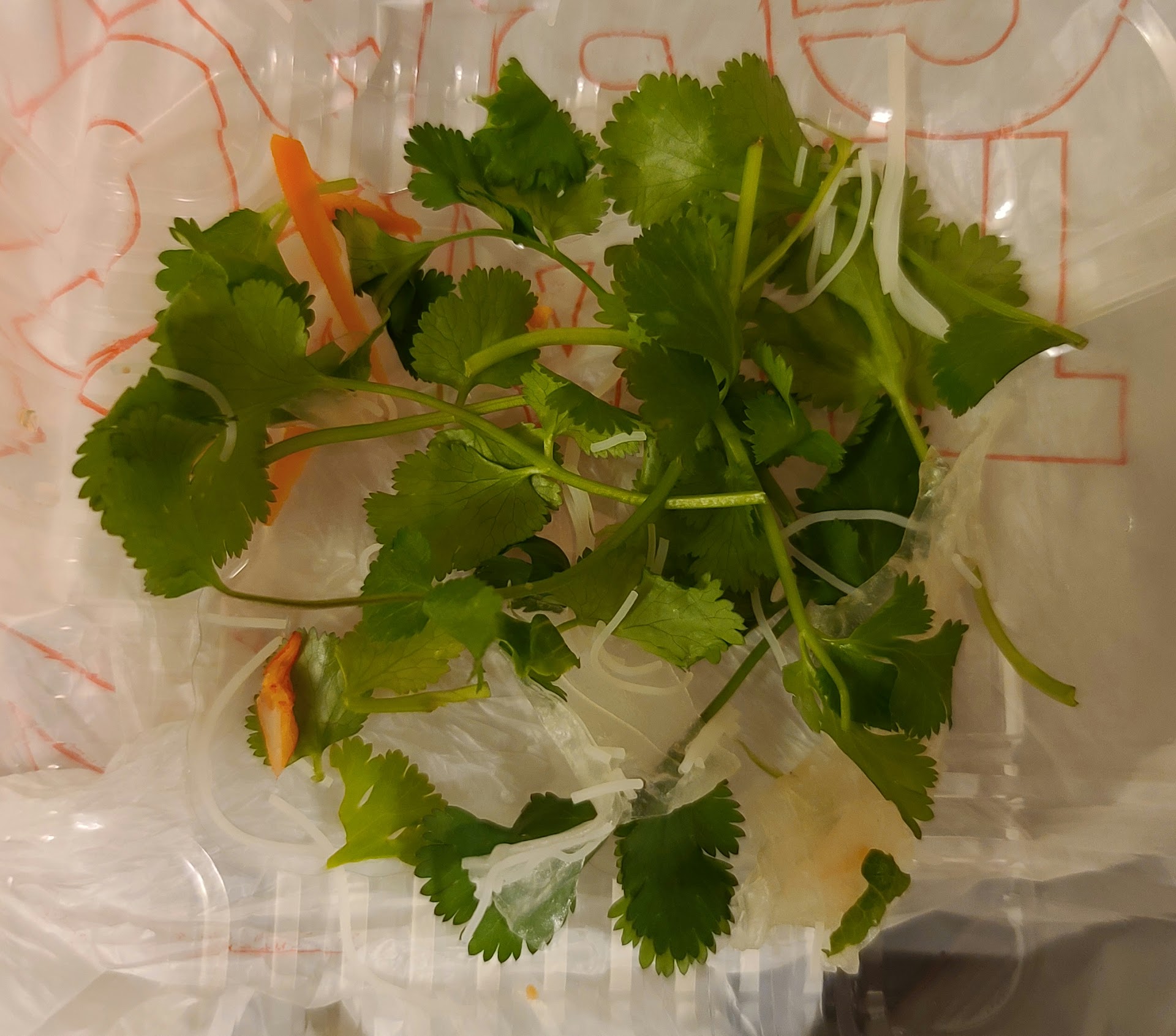 I saw there was cilantro listed in the spring rolls so I told her "no cilantro" and she repeated it. When I got home to chow down, my spring rolls were LOADED with cilantro 😢. The included picture was just the cilantro from ONE spring roll. I had to completely take it apart to try to pick it all out and still missed some. So I guess "no" means "extra."