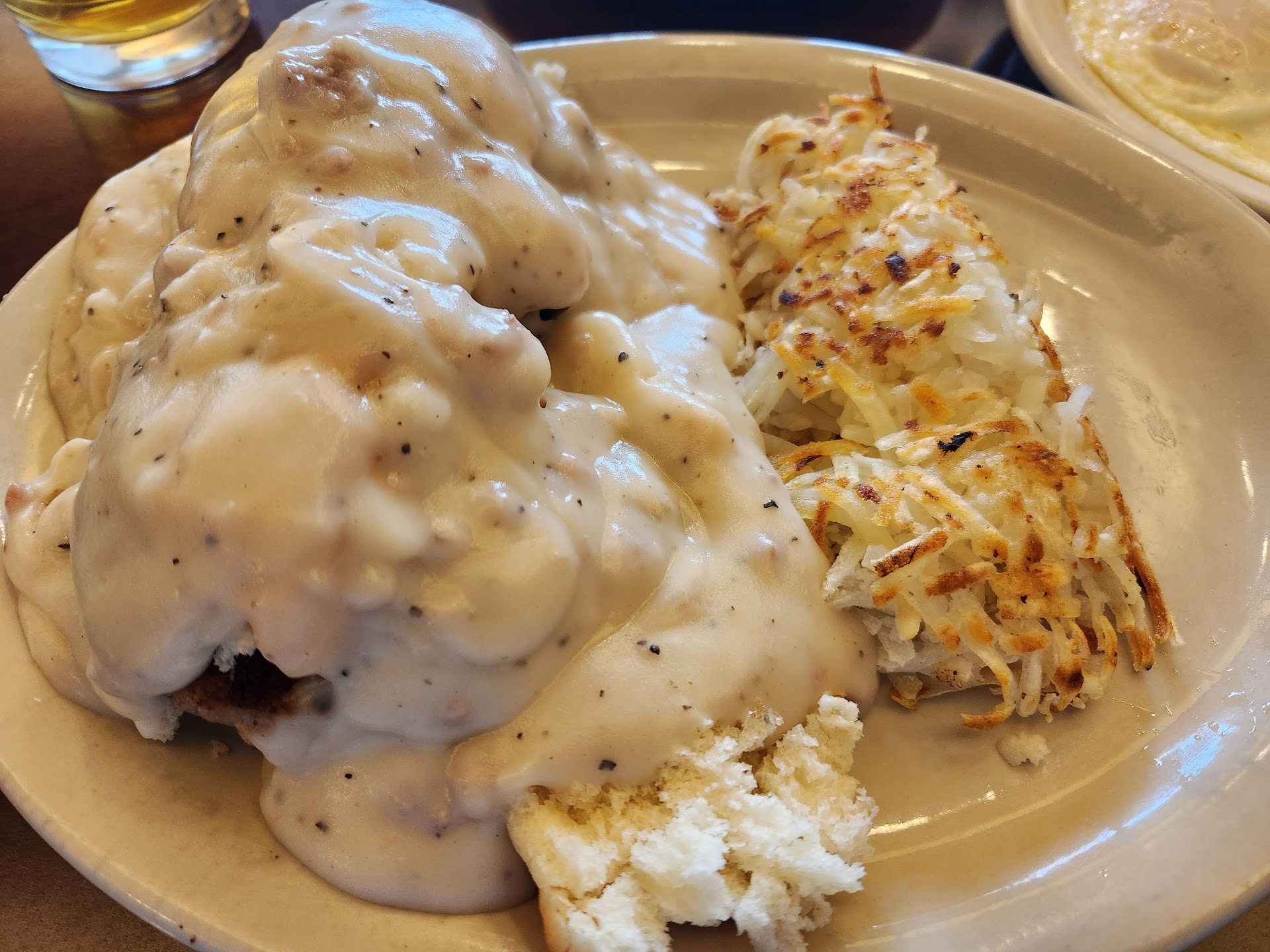 My food was... boring, tasteless, and made exactly like someone who doesn't know what seasoning is, would cook like. My hash browns were literally someone grabbing a pile of unseasoned potato shreds, grilling them on one side, flipping them, grilling the other side, and serving. My biscuits were normal biscuits with a surprisingly large sausage patty covered in normal country gravy. I couldnt finish them. The flovor got old, really fast. My eggs were cooked correctly to their credit, I always order over-medium to see if the staff are paying attention and know how to cook, its the easiest to mess up and something I'm totally fine with eating if they get it wrong. Village Imn got my eggs right.