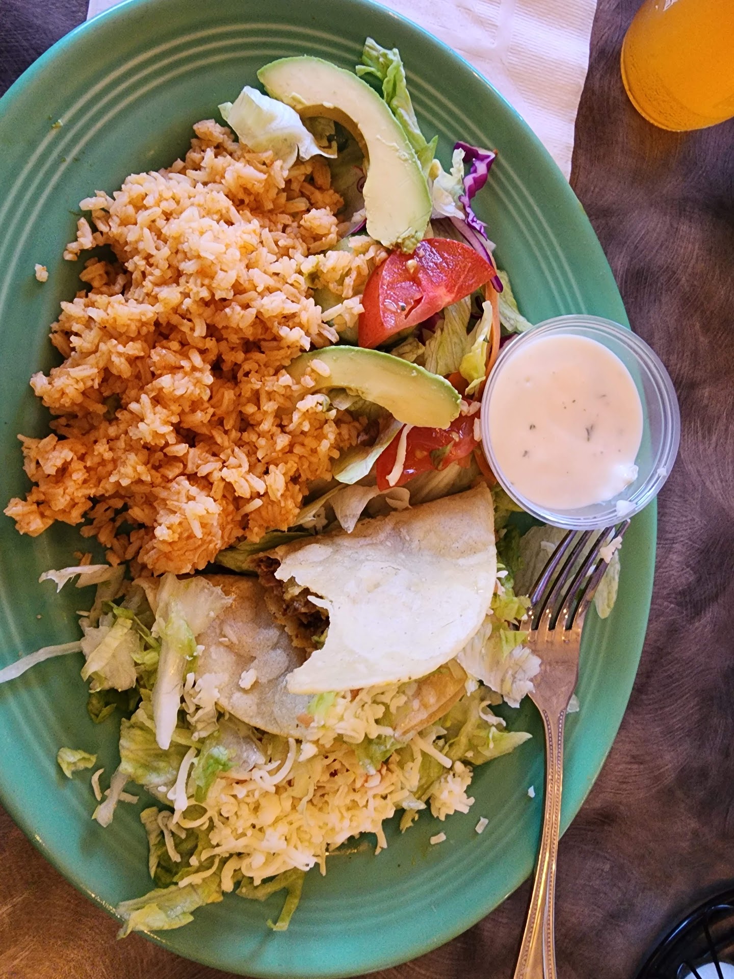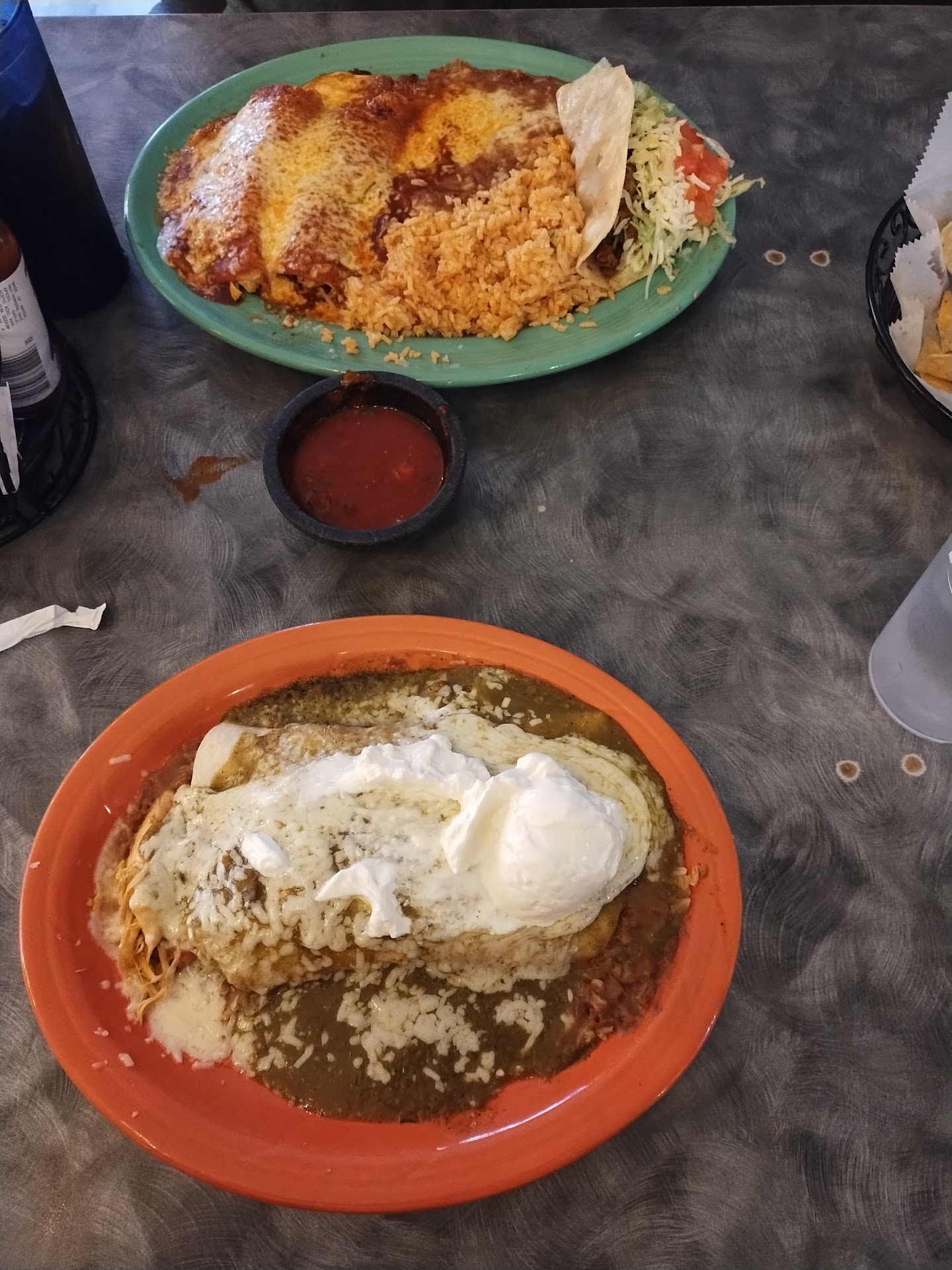 The Host was very nice and quick to seat us. She brought us some beans and salsa for the chips which were great. The chips were both corn and flour tortillas which was different and delicious. We had the enchilada plate with taco and a burrito. The enchiladas were ok. Rice was overcooked. The burrito was weird. The tortilla was not wrapped around like a burrito but it was meat, rice and beans with a flour tortilla on top and then covered with green salsa. I lifted tortilla up to verify and it was not on the bottom just kinda shaped onto the top of the food. It tasted ok.