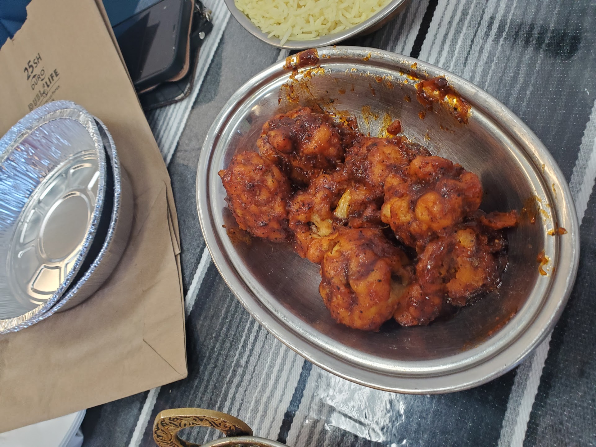 I asked for as "Mild" as they could make it spice-wise. I do not know if the person taking the order understood me as he kept saying "Medium" and I said, "Low on the hot spices please." What we received was a flavorful and mild Butter Chicken and a slightly more spicy Chicken Curry so it was more than acceptable and very tasty. The Tandoori Chicken was a let down, the pieces were from very tiny chickens -- the legs were less than 3 inches long and the thighs were maybe 3 by 1 3/4 inch -- and very dried out. I did have a 10 minute drive to bring everything home; but the tandoori chicken was basically room temperature so I'm not sure it was fresh. The Basmati rice was properly cooked, with a good nutty flavor and either turmeric or a bit of chicken base cooked in to give it a light yellow color (if it was saffron, it must have been the Mexican saffron because it added no flavor.) The naan was very crisp with a lot of chew. The Gulab Jamum, wasn't quite as good as some I've had, but it still maintained that interesting "soaked old fashioned donut" texture and the syrup is listed as flavored with rose water, but all I got was distinct citrus.