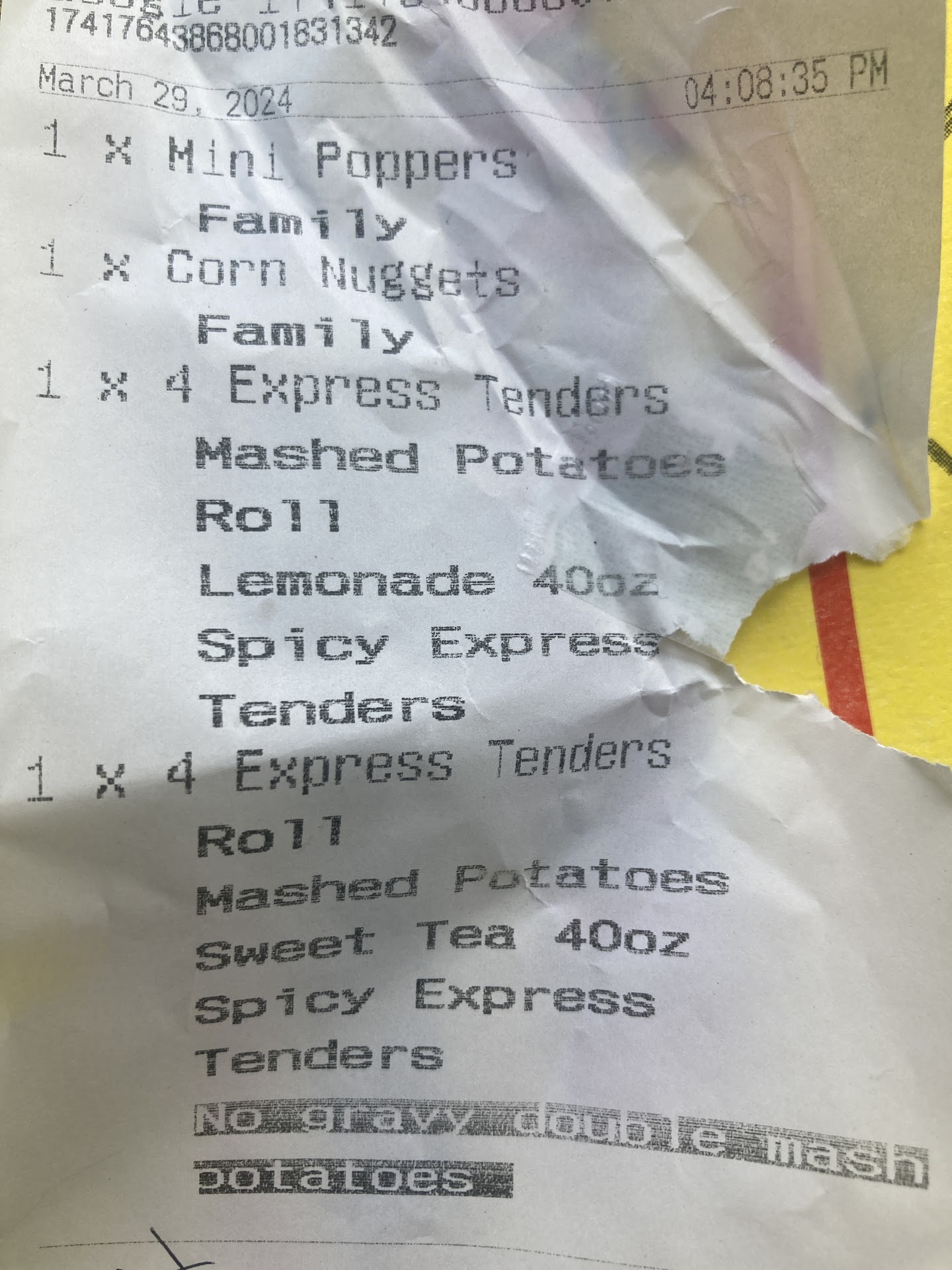 Read more030725: They've gone and done it again! Friday evening my family wanted fried chicken so they sent me for Chicken Express. I got there and the staff was great! They had to help me when I called home to describe the menu items so my family could tailor their dinners. Well, I made it home with a dinner that was missing a side dish. I called about it and they said I had to bring back the whole meal for them to add in the missing side order. They said they'd give me a gallon the sweet tea for my trouble. I don't like sweet tea, but I wanted my mother's dinner to be wonderful, so I stopped eating my dinner and went back to Chicken Express. They provided me with more than a gallon of sweet tea for my trouble! I was able to take my mother a fresh, hot meal, which made her happy. When my momma's happy, I'm happy! Thank you, Kaitlyn for making my mama smile!