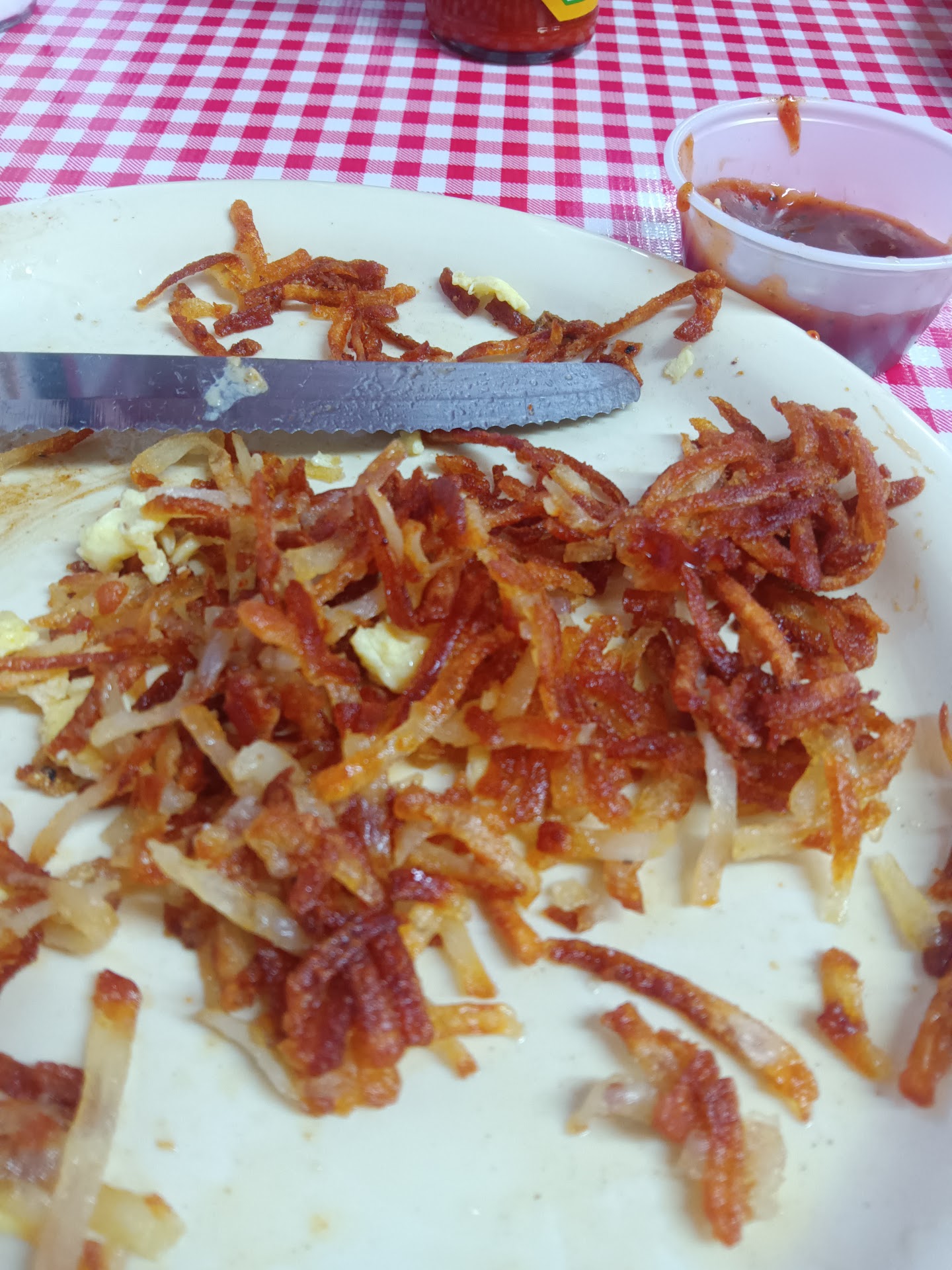 So me and my cousin walked in the entrance and the dining area was kind of empty and saw the booth on the left side was open. There were a few people on the right side booth. I asked the girl at the front counter with the cast on her injured leg if we can sit on the LEFT booth side where I pointed since it was open...she said no and pointed to the right side booth. We said ok no problem... A few minutes after sitting down an older couple came in and they were seated left side of the booth where we wanted to sit.......😳 Right off the bat I thought that was a slap on my face. Like how come she didn't accommodate our request???? It wasn't like it was busy. If it wasn't open then ok, but no one was there when we came in.... Now for the food. My cousin ordered a catfish special with two sides (Mac n cheese and fried okra) and I had the small breakfast plate with escgrige sausage, egg, crispy has brown, and a pancake....... I'll get to the point. The food was below Mid!!!!!! The catfish was nothing special and the breading was like a brick, Mac and cheese was bland and dry, not even hot or warm, and the okra was just...again nothing special. My food was the same... I got scrambled egg and......you can't do anything about that, I ordered my hash brown crispy and it came out overcooked xxxxx crispy to death (see pic). I couldn't finish it. The sausage I got was so so or below mid. The pancake was actually ok and it was a great size.... Now my waiter, she was training a new girl with her. We ask the waiter what kind of catfish it was, is it swai???? She wasn't able to give me an answer and just said it was a real catfish with a confused expression! Another thing that also grinds my gear was when my cousin told me he had been here before and the bearded guy was his server then. The bearded guy had asked my cousin if he wanted any toppings on his pancake..... See I didn't know I had that option to put toppings like blueberry or pecan on my pancakes which the server failed to do so. She did not elaborate or even asked me about that and she was training another server with her too!!!!! Like yo, you just failed as a trainer... The new server is set up for failure.... So I had already got the pancake and it was just regular but if she would have explained or offered me toppings, I would have gotten some toppings on my pancakes...😧😧🤦♂️🤦♂️... I usually give good tips like 20% or more. I only gave 11% because of what I just explained (I probably should have given Zero tips based on the experience and service).......To the owner or general manager of the restaurant, if you are reading this, please retrain your front counter girl and teach her how to accommodate customers if it's feasible, and please replace your trainer for servers because my server as I explained already does not know how to educate customer or even elaborate on certain menu items..... My experience here was miserable from the moment we walked in. My cousin had suggested this place since I never been and I CAN 100% GUARANTEE WILL NEVER COME BACK AND I DO NOT RECOMMEND THIS PLACE.....I REPEAT, I DO NOT RECOMMEND THIS...