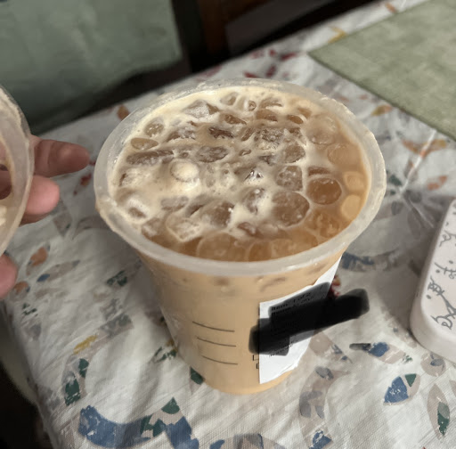 My friend and I decided to go outside to be able to talk comfortably. There were speakers outside, and we moved down to Chipotles outside tables. They weren't open yet, but out of courtesy, we asked if we could enjoy our coffee at their table. They were very nice and said it wasn't a problem and were thanked for asking. Starbucks, please turn down the music...