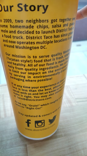 Overall it was a pleasant, clean-feeling alternative to Q'doba and/or Chipotle. I wouldn't rate it super highly for what I got, but then again, I got a burrito and not a taco at a place called District Taco....
