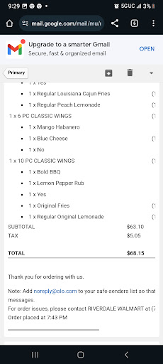 Read moreThe food is fresh and delicious but the process is extremely long! They open at 10 but really 10:30. The cashier took my WHOLE ORDER then told me that his register doesn’t work bc he’s not assigned to it😒 then if you get wings they don’t come with a dipping sauce. They will offer you a sauce but won’t tell you they are 60 cents, even the first one. Then when I put my hand out and said thank you for my food, the cashier went around my hand to put the food on the counter. I ended up leaving the food Ayer I paid bc I was extremely annoyed. The manager eventually showed up extra late and I guess was now ready to give out a drawer. Two other customers left without ordering since they didn’t have a card for the kiosk. I’m upset bc I normally...