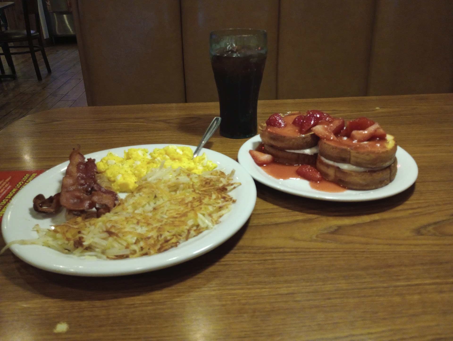 When we got our food it was okay. Our milkshakes were basically flavored milk. It seemed like they had been sitting out melting for a while prior to us receiving them. The sausage and bacon were stone cold but the eggs and pancakes were warm. One of my biggest complains however, I receive a little cup of icing to go on top of my cinnamon roll pancake. The icing was hot and runny. When I poured it onto my pancake I looked inside the cup and there was a thick layer of solidified icing around the bottom edges and the sides. It seemed like to me that they just refilled someone else’s used icing cup and gave it directly to me.