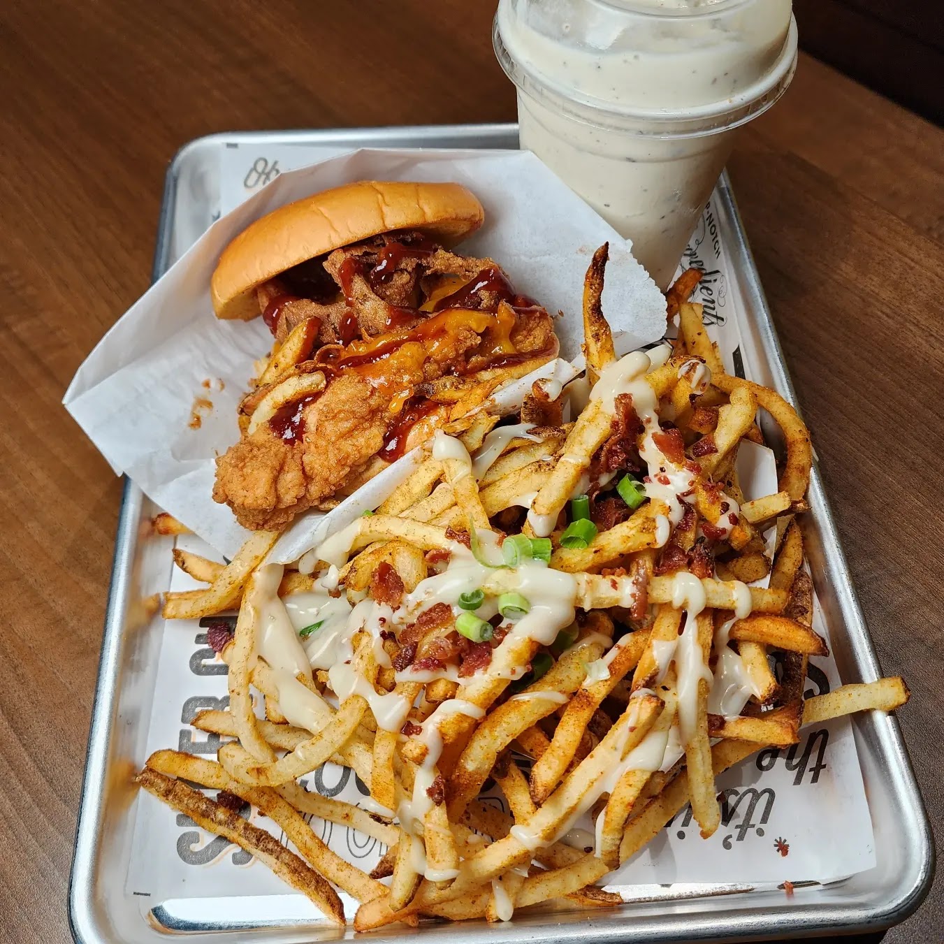 Quite possibly the Best Fried Chicken Sandwich in Utah!! It's definitely my new favorite! E v e r y t h i n g on their menu looks soooo delicious, I had a hard time choosing. What I ate; •The Cheesy BBQ, which is a fried chicken filet, cheddar cheese, onions rings, and BBQ sauce. •Loaded Fries, which is seasoned fries (I chose cajun) topped with Queso Blanco, bacon, and green onions. •Cold Fusion, which is a thick frozen custard blended with mix-ins, I chose Reese's Peanut Butter cups. The Chicken Sandwich was INCREDIBLE! A thick JUICY filet with great breading. I loved the toppings and how huge it was! The Fries were also soooo good! I wanted a boat of that queso tho, especially with the cajun seasoning on the fries. Highly recommend their custard, it's so smooth and creamy. The big chunks of reeces were a great surprise! Ohhhhhh and they have a sauce bar!! I need to bring the family back because we all LOVE sauces so much. Their Nashville sauce actually has some HEAT! Their honey mustard was mild and tangy. They have a great ranch and signature sauce, too! I'm definitely impressed. I can't wait to go back! Go check out SUPER CHIX TODAY!