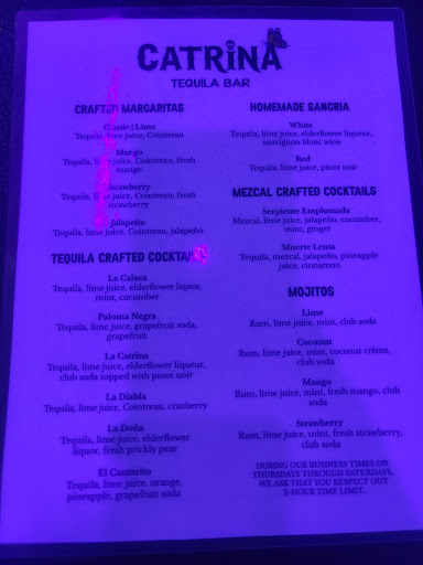 Read moreNice little bar in downtown Riverside that is quite the treat. Started off with a guacamole and chips appetizer which was tasty but the guac was a browning already which to me, shouldn't have been served. Ordered a classic margarita on the rocks, which is delicious, and then had a mango margarita which was very tasty and sweet. I typically don't like my drinks too sweet but this was a one and done. It was however, very tasty and am definitely not knocking it, just not my preference. The decor is all about the Catrina and the calaveras. I like the alter above the bar and other decor. The only thing that confused me was the sign that states the 2 hour limit. Doesn't seem very inviting as that is the first thing you see especially when I get together with friends, we like to dine, have drinks,...