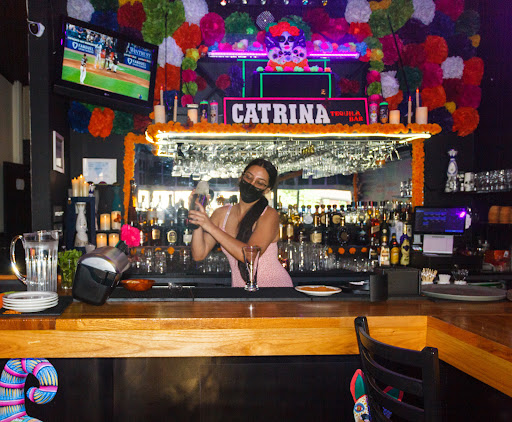 DECOR Upon entering, you are greeted by a La Catrina statue, the symbol of The Day of the Dead, which the entire place has a theme of. Whether or not you drink tequila, it's worth a visit here just to see the painted murals & artwork hanging throughout the bar. It is evident how important festive decor is to the owner. Every detail has been attended to from the front entrance to the emergency exit door in the rear. Each table has a centerpiece of battery-operated candles hugged by bright orange marigold flowers with a butterfly. There are white pillar candles wrapped with red roses placed along the bar as well.