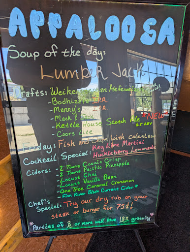 Read moreA mountain of high quality perfectly prepared food! I came in a little after 11 o'clock on a Saturday, assuming that they would only be serving lunch even though I was really craving breakfast. To my delight, the waiter told me that I could order either breakfast or lunch. Awesome! I ordered a ham and cheese omelette which comes with hash browns and choice of toast, biscuit, or pancake. I chose the pancake. Surprisingly, my meal was ready in less than 10 minutes. And it was perfect. Everything was huge! I knew immediately that I would only be able to eat half of this delicious breakfast - I would take the rest home and eat it for dinner tonight. The ham in the omelette came in nice big chunks, with all the fat trimmed off. It was tasty lean perfect ham! When I ordered I forgot to say what type of cheese I wanted in the omelette, but it came with cheddar, which is exactly what I would have ordered. Perfect! I'm not usually so crazy about hash browns, but these were great - finely shredded, nicely browned, and not greasy at all. And there was a really big portion of them. The pancake was really good, too. Everything just excellent! I only got water to drink; would've liked coffee with breakfast, but I need to be frugal, eating a meal out like this is already splurging. Plus I have a full thermos of fresh coffee in the car that I will sip on as soon as I leave. My waiter was Nick and he was friendly and accommodating and overall excellent. I wouldn't be able to complain about anything here at the Appaloosa - even if I was looking for faults I wouldn't find them. ...