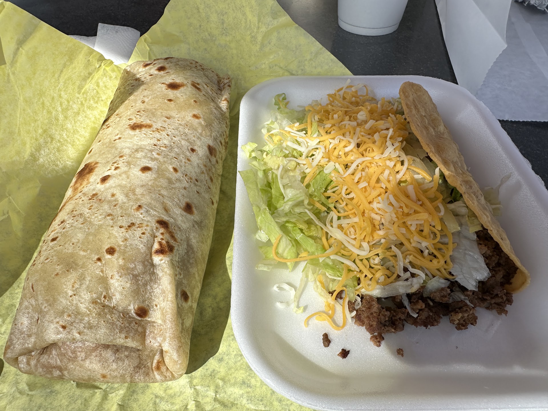 Additionally, the bean and cheese burrito had an abundance of beans, but needed more cheese, as it had all melted and clumped at one end of the burrito.