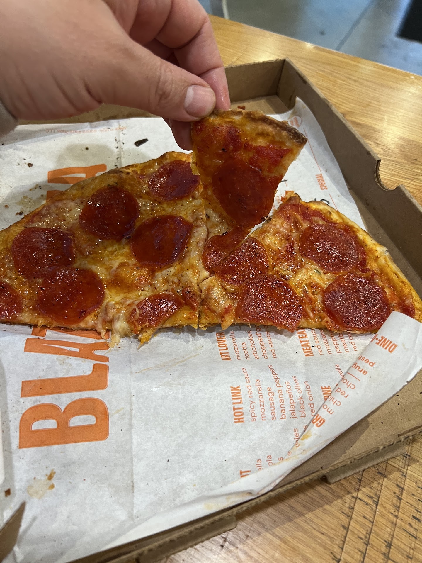 The not great: no towels, or soap in the restroom. Also, there was an employee in there watching YouTube videos for at least 25 minutes⦠the main entrance door has not been cleaned in months. There are clearly no cleaning schedule or protocols in place because there was literally trash all over the place. All of the tables were filthy. This is the only blaze I have ever been to where the signature black barrel trashcan was overflowing. The floors, tables and chairs were full of crumbs. Lastly, none of the pizzas that we received were cut evenly which wasnāt the worst thing. Honestly, the symmetry doesnāt bother me that much but what did bother me is that the pizzas were not cut all the way through. So my two boys struggled to pull the pieces apart without taking the cheese from another slice with it.