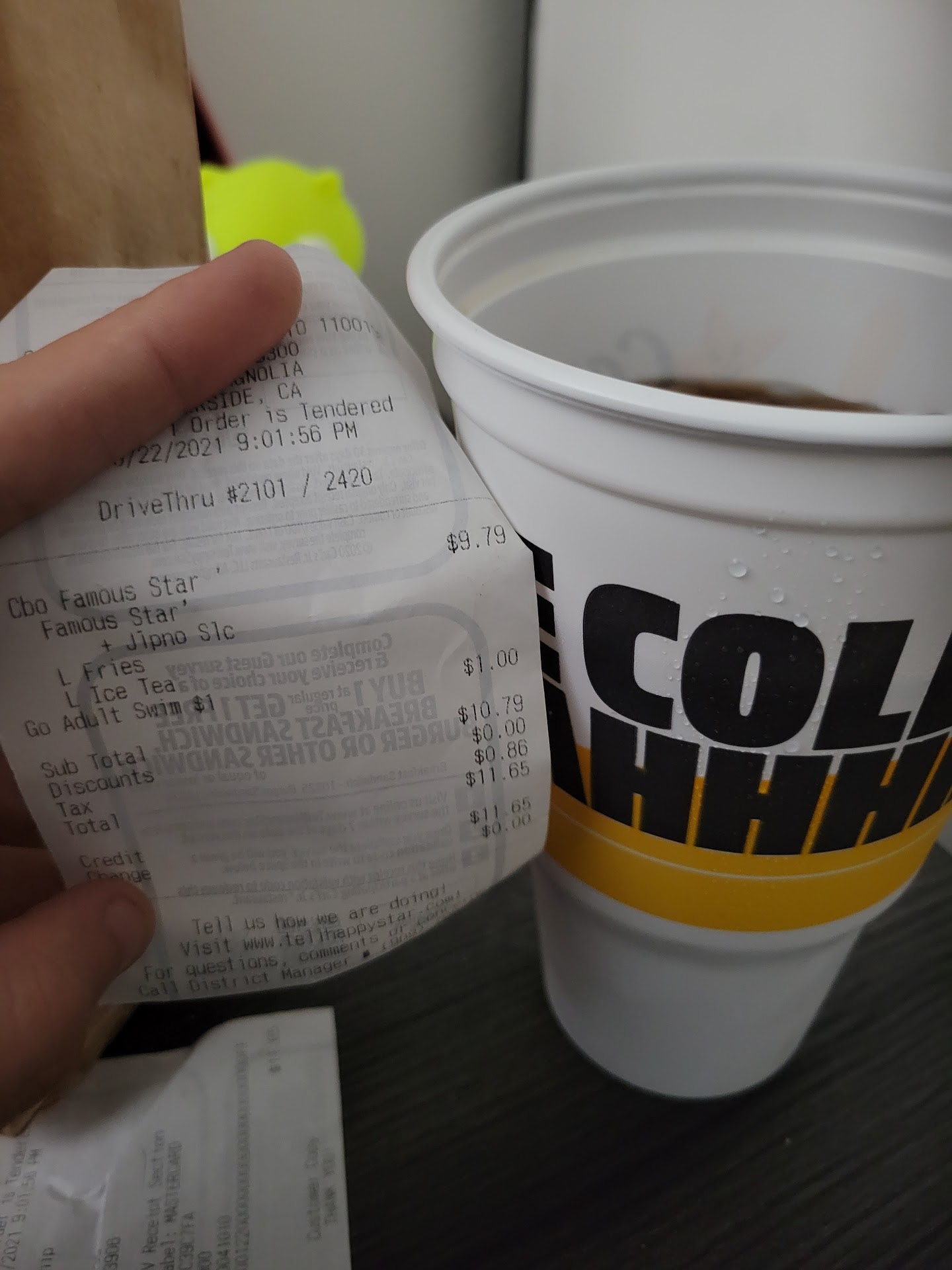 Read moreZero stars if I Could. I used to be a worker at this Carl's Jr and let me tell you, disgusting. Instead of using the tongs like they should, you'll find the line cooks using their hands with gloves to do so in order to be more time efficient. Where they promise to rotate the fries, onion rings and the fried foods, you'll find them sitting there for about an hour on a slow day. When you ask for fries with no salt, they'll just put the old fries in the basket, dunk them into the fyer again, and shake out the salt. Look, "fresh" unsalted fried.