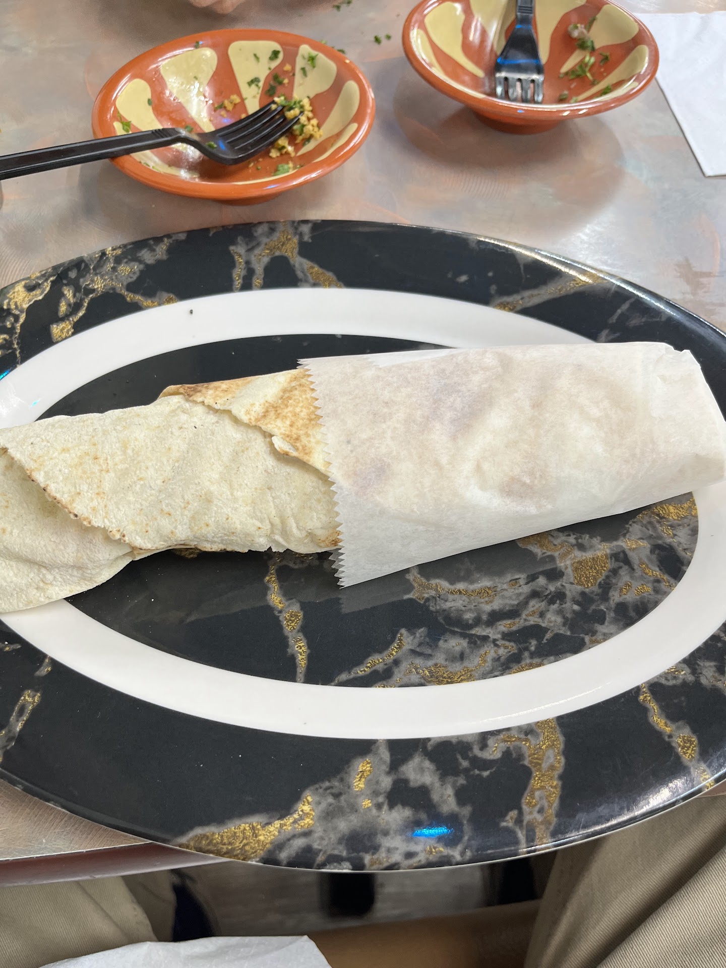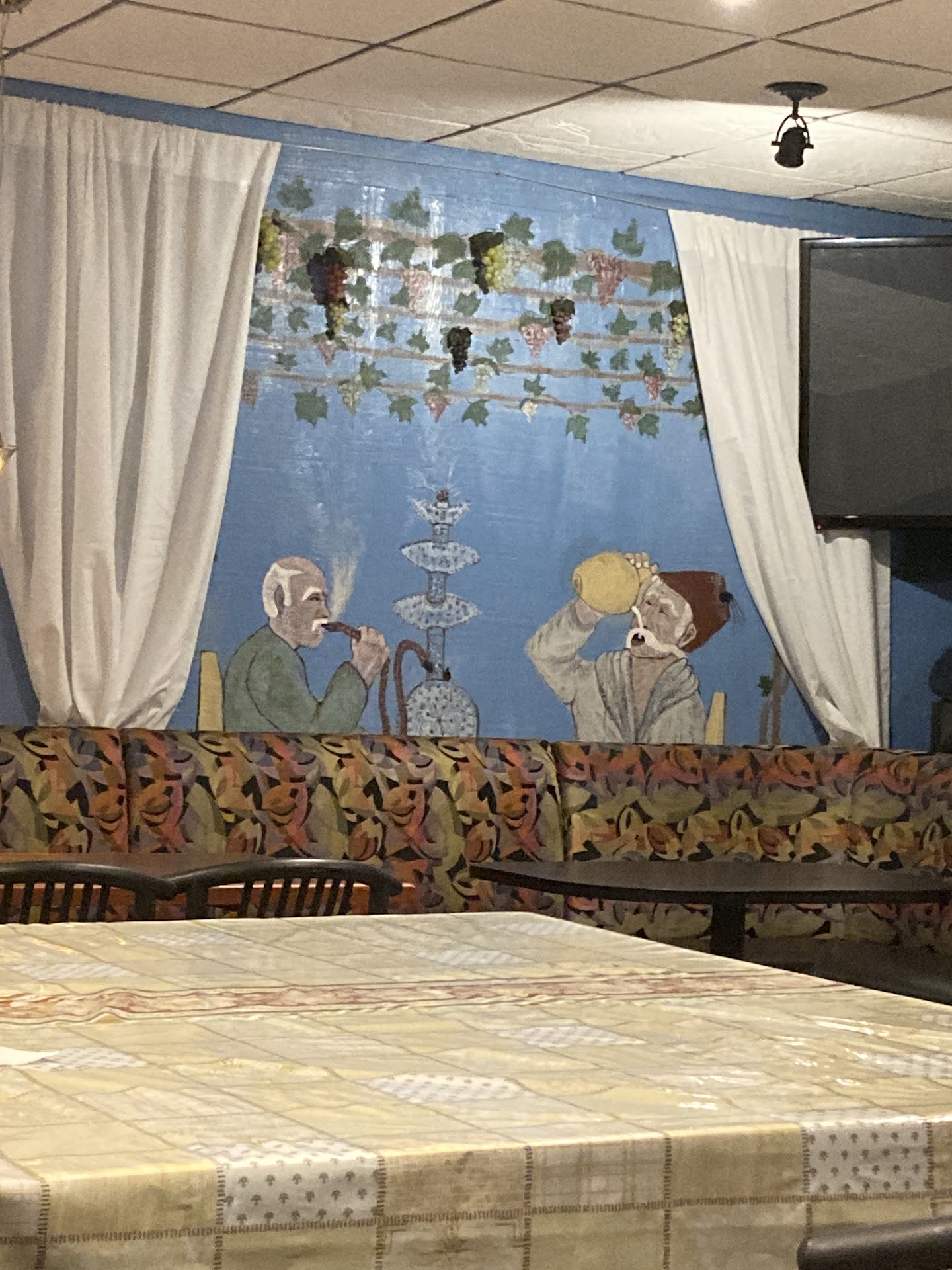 The ambience is... well, confusing. From the outside it's not horribly clear that there is seating inside, and the booths are not horribly comfortable. There are a bunch of figures (salt shakers, statues, etc) that my wife supposed were supposed to be Lebanese chefs, but I thought were more iconic of Italian pizzarias.