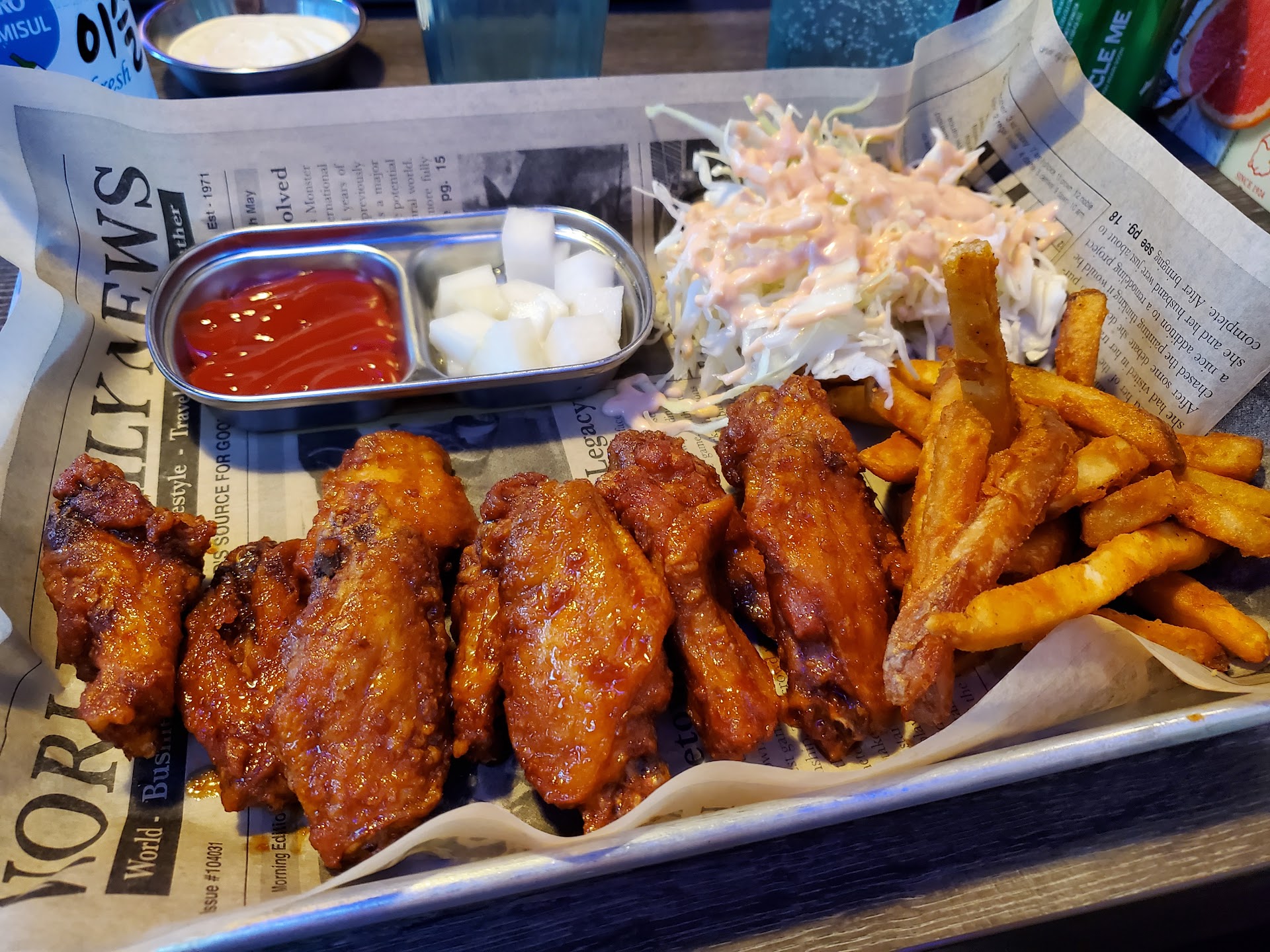 Now the bulgogi plate has gotta be top tier. After a quick palette cleansing with some peach soju, time to get to the good stuff, the wings. Their double fried method definitely keeps the crunch going. The garlic soy flavor was nice and savory. All the while the sweet and mild was nice and tangy. After some slaw and pickled radish, you know, we had to finish off with that great lemon pepper that everyone loves. Gotta check them out....