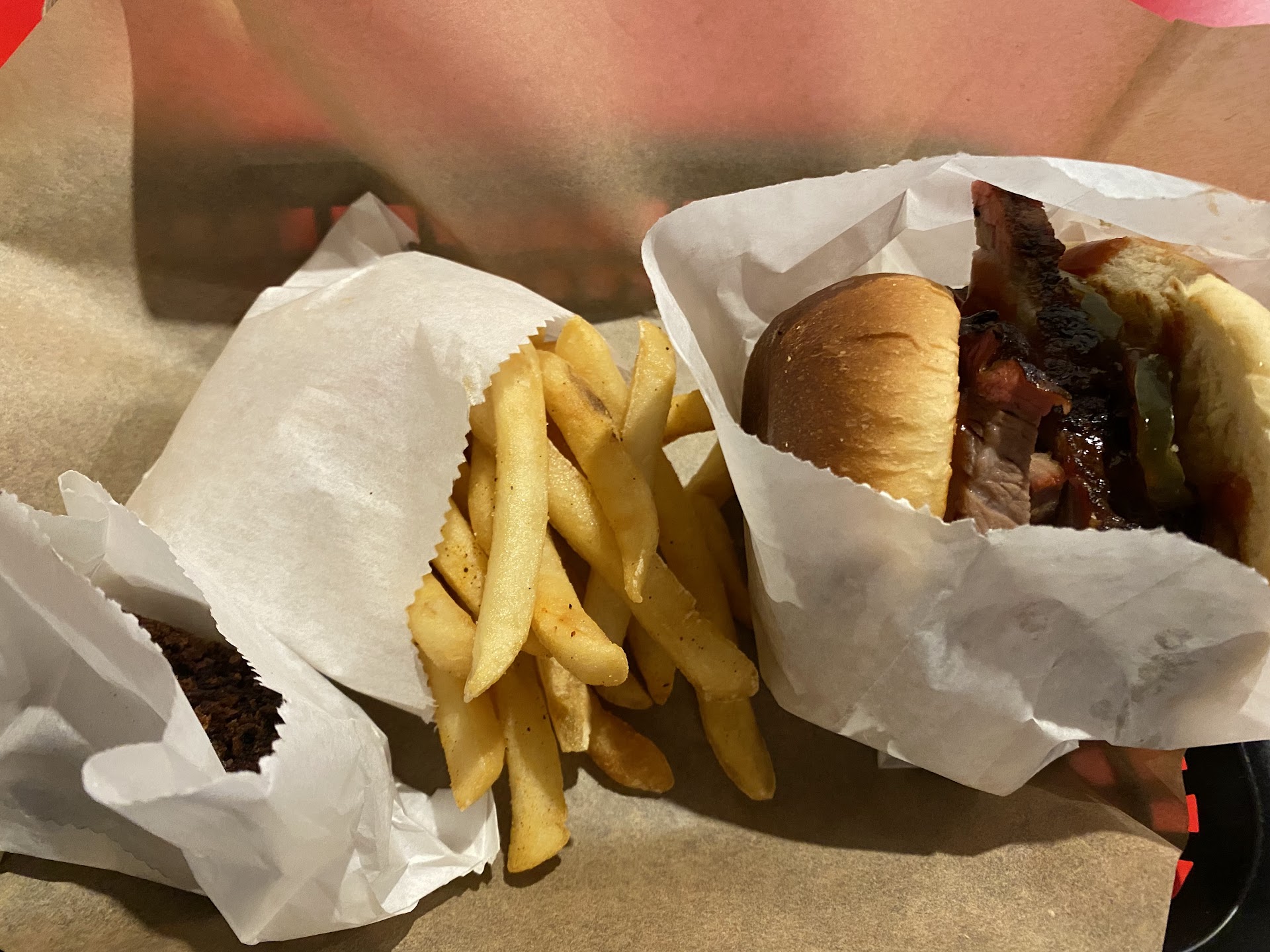 My wife and I had been anticipating this place for literally years. We first noticed the new building going up, I think it was early 2020 or late 2019? And began speculating what might be built. When we found out it wasn’t yet another chain, but instead a local BBQ style spot, we got excited. Then the world shut down. Construction seemed to stagnate. It seemed at times like this place would never open. Then it finally did, but the hours were not good for our work schedules. We are rarely in the area when they are open. Finally, on a Monday we were able to stop in for dinner. She got a Jr cheeseburger meal with coleslaw, I got a Jr tri-tip meal with fries.