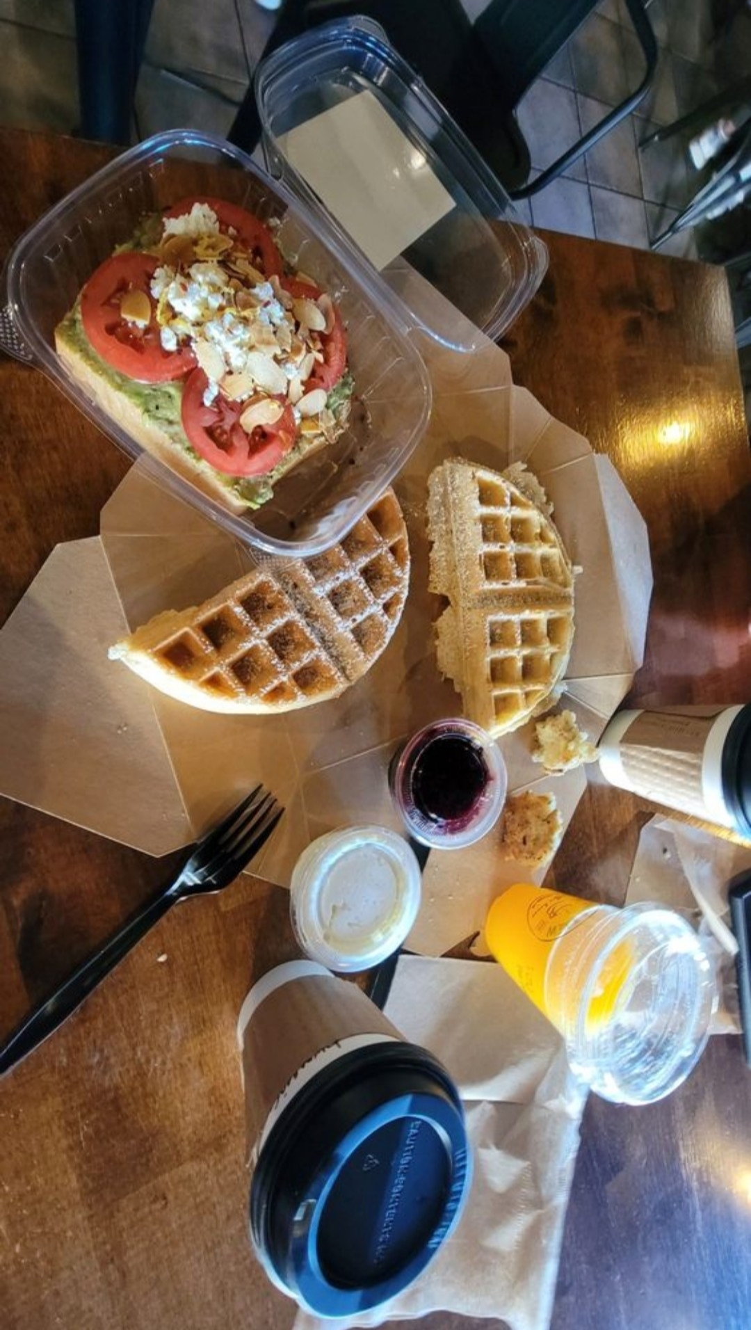Read moreWas it worth it?? Line was out the door when we first arrived! Thinking to myself, is this really worth it? Must be if this many people are waiting. Boooyyy they did notI disappoint! We ordered a waffle, some type of biscuit, and the avocado toast. All delicious. My husband ordered a latte that was very good and the fresh squeezed orange juice - wow!! For my drink, I ordered off the Naturals, Golden Tumeric latte. This is not a sweet drink, all natural flavors, (so I would recommend more honey if want it sweet) hints of ginger, don't really taste the black pepper but you feel good about your drink for your body! The inside is warm & dark. Since they are pretty popular, they get busy, so noise levels are not somewhere one could relax and read a book. It's more of a, get together with friends and catch up or simply people watch from the seats by the wall. Outside seating is available too. Needless to say from my pictures, we've been back and...