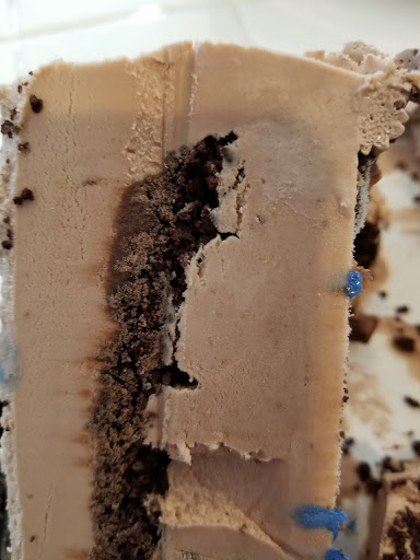 My wife ordered a Reese's Blizzard birthday cake for me with chocolate frosting and ice cream instead of vanilla. The top layer is supposed to be a Reese's Peanut Butter Cup Blizzard. This layer was 99% plain soft serve chocolate ice cream. The middle layer is supposed to be a cookie crunch with fudge. The cookie crunch was there but there was no fudge at all. I was pretty disappointed that my Blizzard cake didn't have Blizzard in it.