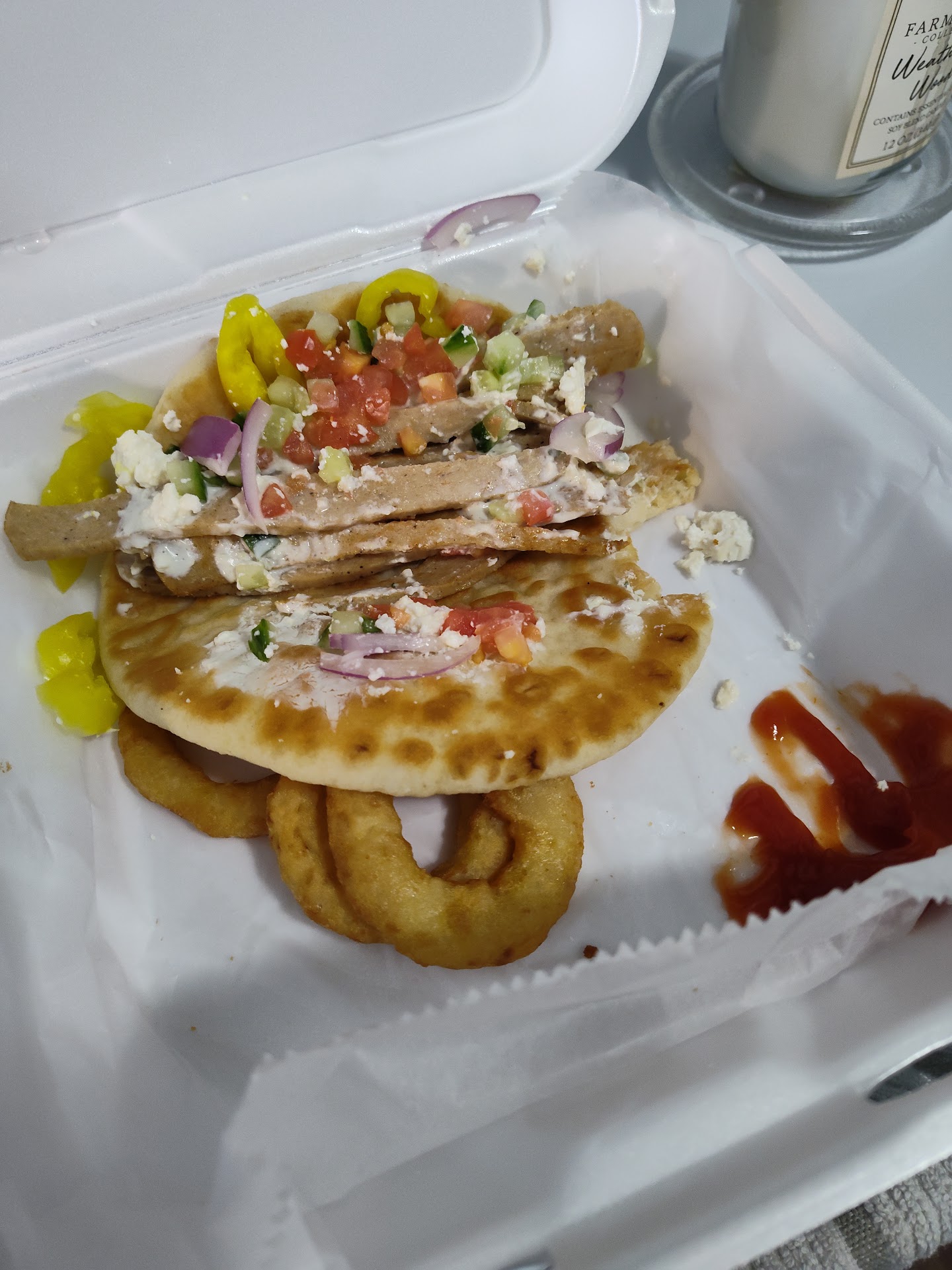 Read moreI just had to check out a quick stop restaurant that had a 4.9 review score. This is a quick place to grab a bite, not fancy at all. That being said, it was clean and ready for customers when it opened at 11, and people were ready to enter. We had chicken shawarma and gyros, which were great and flavorful. I got a side salad instead of fries. I think it is one of the best side salads I've had, with varied vegetables, feta, and Greek dressing (some oil and vinegar variation, I enjoyed it). They had a spit spinning with either beef or lamb, to and we were the only ones I heard ordering chicken, so I think maybe I missed out on what they were best at, but I have no complaints on my food. Be aware it is messy with sauce and spillover, but I really like that, so long as I don't ruin my clothes. Very basics in fountain drinks and a decent selection of bottled drinks. Try the Greek fries (with feta and I think that Greek dressing). I kinda wish I got both the salad and the fries, both were great. I'm sure some will be bothered to have to ask for a key to the bathroom, but I appreciated a nice clean restroom. I'm sure they have good reasons to have had to do that. A great stop, and you could tell by the crowd there at lunchtime that they were regulars who knew what they...