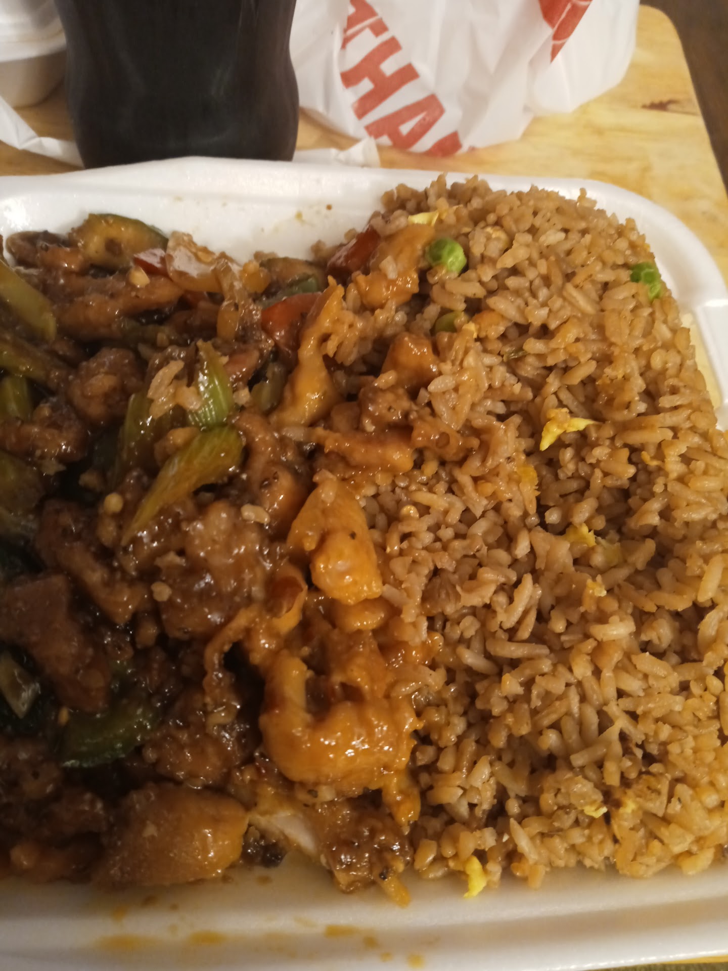 Read moreOk.... So I paid $12.23. They were very friendly. They even gave me 2 LARGE bottles of hand sanitizer for free. I ordered 3 size plate. Rice, chicken jalapeno ( had lots of it in my container lol why not sure why they serve like that, it was more than the meat) sweet n sour chicken, and pepper veggies chicken. The size is good but look at my picture of the jalapenos lol. ( My battery was low so no lighting sorry) Also is that really chicken or is it CHICKEN FEET??????? I DIDN'T EAT IT BCUZ I GOT SCARED BCUZ IT LOOKED LIKE PIECES OF SHAPED CHICKEN FEET. NOOOO LIE!