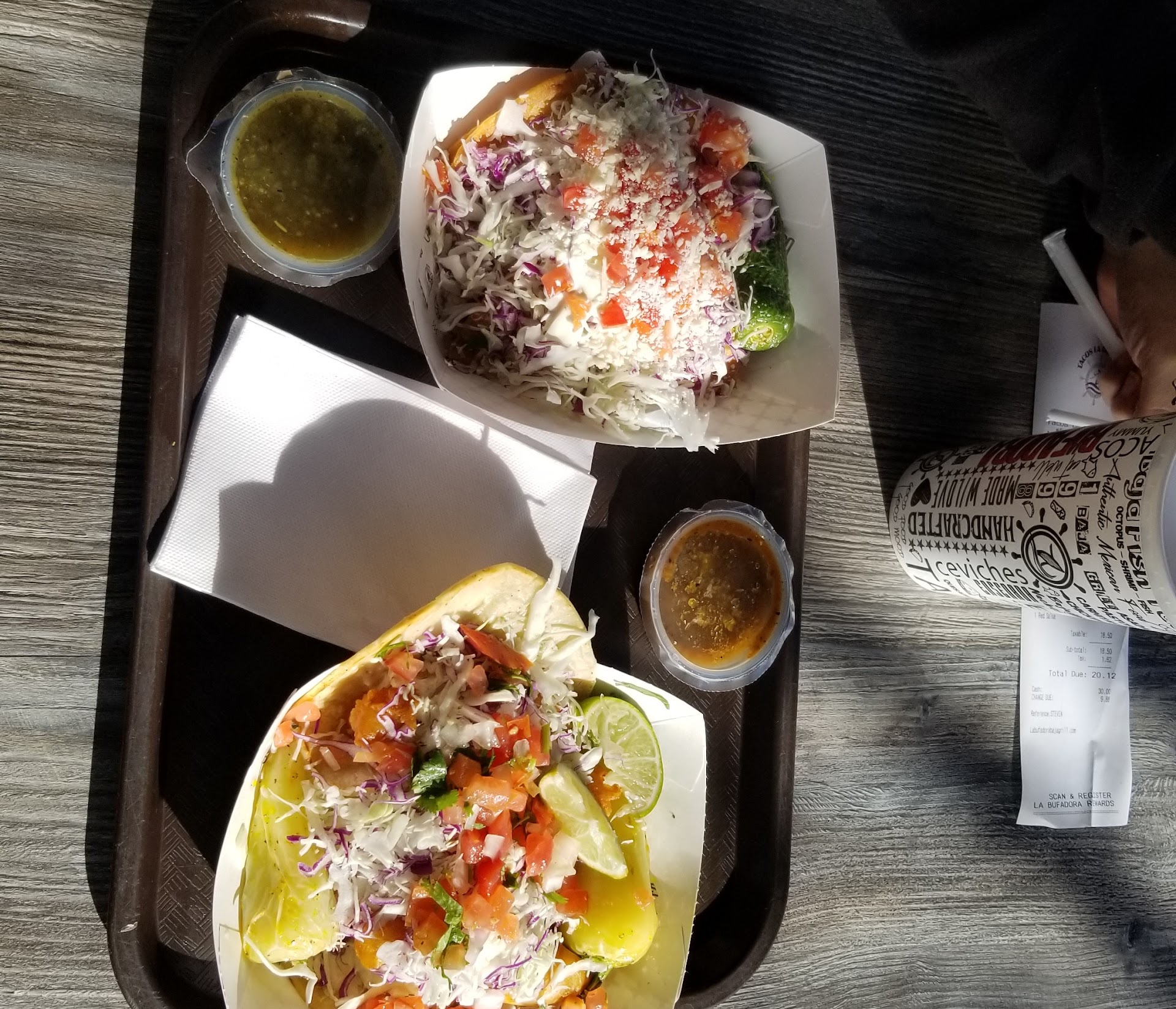 There is no waiter or waitress. You order and sit somewhere of your choice. When your food is ready, they call your name. We got fish tacos, asada tacos, shrimp tacos, and two drinks. We ordered piña and horchata. What I liked is that they ask you how much ice you'd like in your drink.