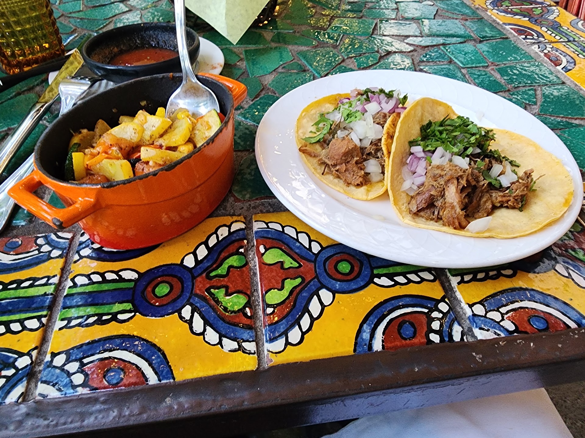 While the decor may appear to be simplistic, if you take time to walk around, there is an obvious attention to detail. Space heaters, Mexican tiled tables and iron chairs, cement mission bells in strategic locations, a fire pit, suspended lighting, Chinese vases and decor in the building structure above the tables, a trickling fountain at the entrance and small but beautiful sitting area with antiques on the way to the restroom.
