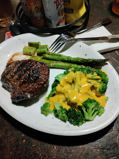 I really wanted to love this place, but sadly, they missed the mark for me on my first (and what may be only) visit. I went on a Friday night relatively early, and the best way I can describe it is CHAOS. They're understaffed right now, so I get it, and I'm not even going to bring up one or two of the negatives connected with that. But staffing ultimately comes down to management. But the place was packed, and apparently that's all that matters. For the food, there were pros and cons. I grabbed the sirloin entree, and the prep was good, but the portion was very small, probably a 4-oz cut (the menu doesn't specify weights). At $20 for the plate, the pricing is acceptable, especially since it includes a cup of an excellent soup that they called 'lobster bisque' but is probably closer to a lobster chowder. The prime rib was a good portion, priced right, and well prepared, if a little salty. Both plates would have been improved with a bread option, but that's not available. Some cons: I ordered mushrooms for my steak, but they never came, and I was never actually able to see the bill, so I don't even know if I paid for it. But at $1, I don't really care. I do care that I never got a steak knife (or any other kind of knife), despite asking multiple people for one. I had to borrow a knife from one of my table mates before my steak got cold. But what happened later might help me understand why it was so hard to get a knife. They had to serve the water in paper cups, and they apologized for it, but, still. And it never got filled. A thousand drinks came out of the bar, but never a pitcher of water. Did I mention that the steaks were a little salty? Yeah, I needed some water. But the place was so crowded, our server only made it out to our table twice, once to take our order and once to collect payment. We saw food runners and a busser, but they rarely made a sideways glance our way. It was so loud on the patio that the only way to communicate was shouting. And we had no idea that it was karaoke night... which, apparently it is every night. But there was a private party on the other patio, and no room inside, so there was literally nowhere else to sit. And then a fight broke out! (is that why there were no knives to be had???) We had to leave, so I pleaded with the busser to locate our server. She came, but I never actually saw the bill on the hand-held device, just a total. But after almost 2 hours in the restaurant, we were so desperate to get out of there, I didn't...