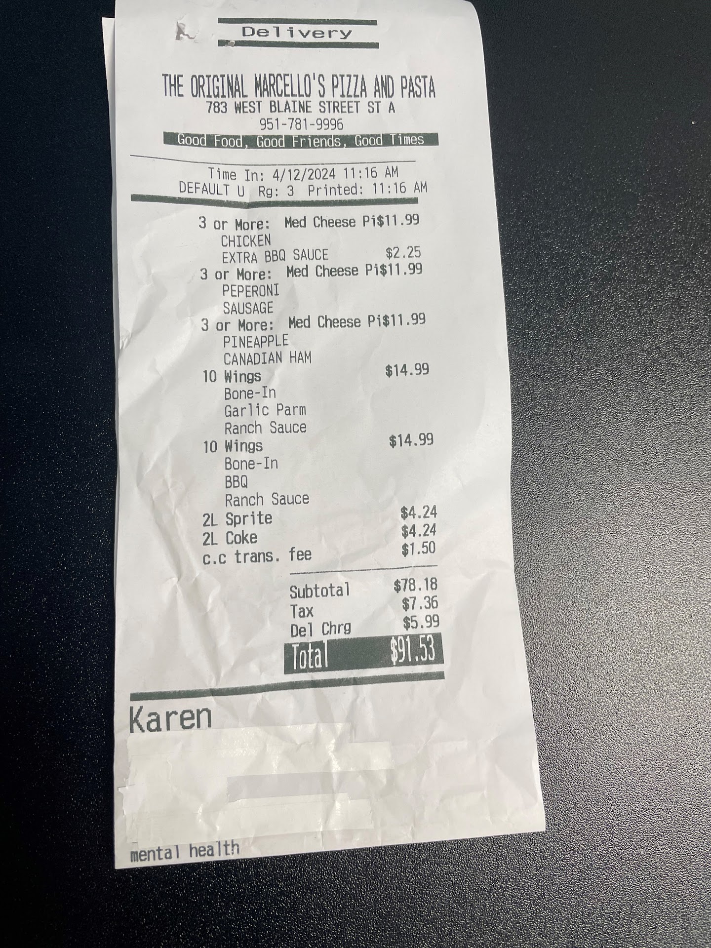 -Customer Service: This is a major point for me. I'd rather an alright pizza and great service than the other way around. I can thankfully say that in my experience Marcello's has gone above and beyond to make us happy customers. For instance: we ordered the BBQ chicken pizza, nor knowing that it comes with bacon on it. When we discovered it had bacon and called them about it, they didn't hesitate to make us a new one immediately. Some places might argue that they weren't in fault; Marcello's could have definitely said that and been correct, but they didn't! That to me is the definition of customer satisfaction and there are not many businesses that dedicated to making and keeping customers.